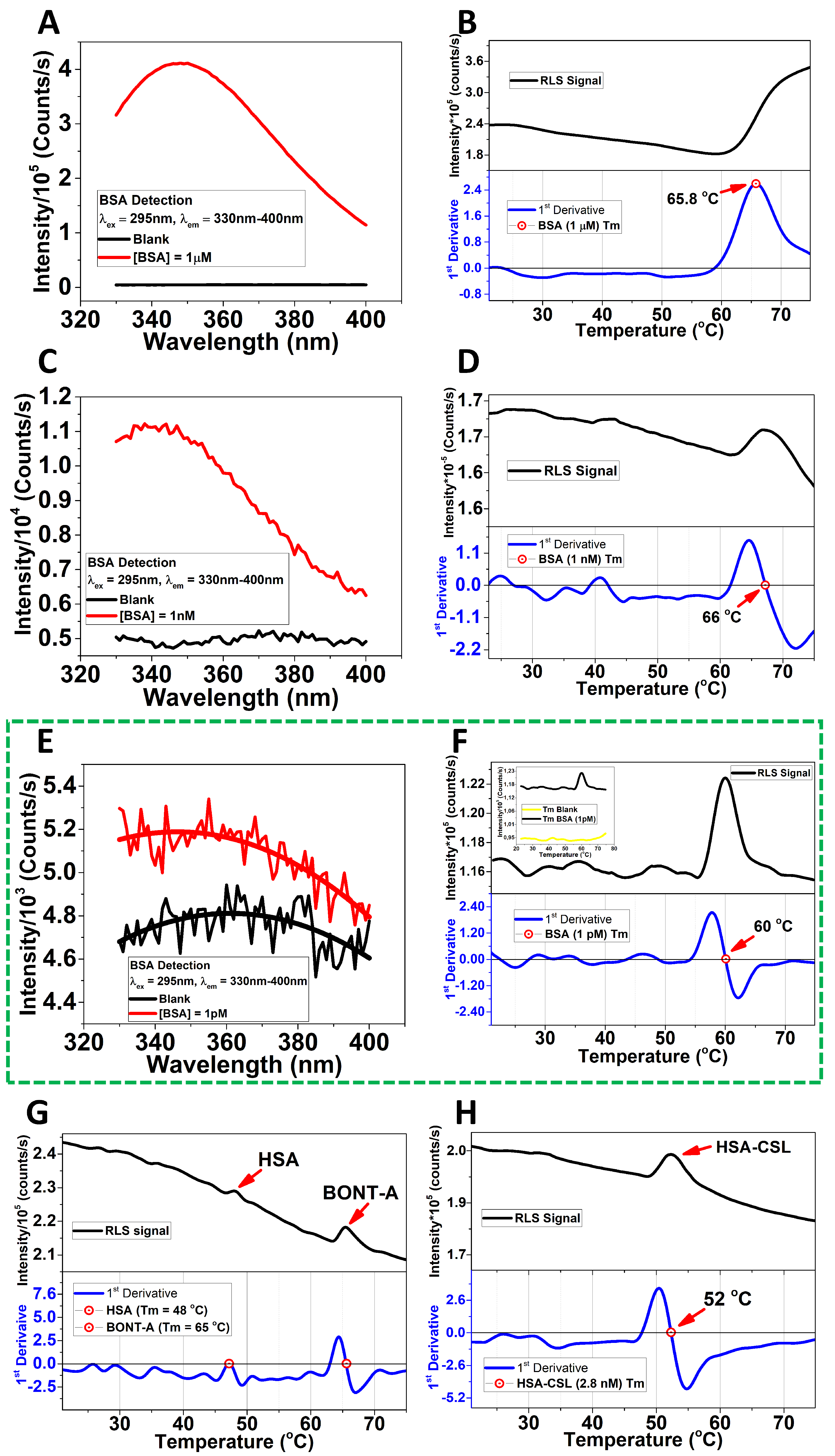 Figure 1B). Here, we determined the melting point of BSA at different concentration from 1 pM up to 1 µM by RLS, exciting at 295 nm and scanning from 20 to 75 °C and/or 20–90 °C (see