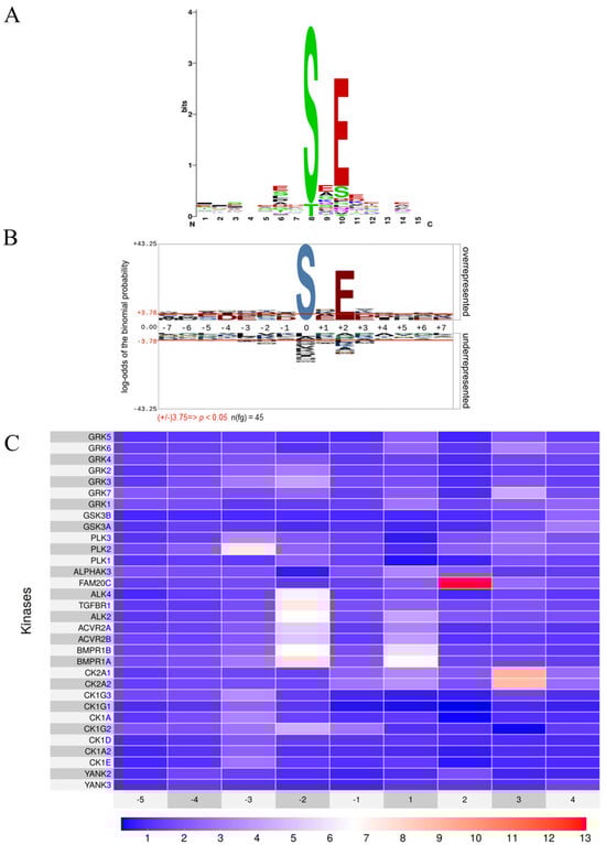 In this study, we present an updated and comprehensive compilation of all known phosphosites phosphorylated by FAM20C, whether identified through vitro assays or in cell-based studies, and whether on synthetic peptides or full-length proteins (Table S1). To analyze sequence motifs within these phosphosites, we utilized two motif visualization tools, WebLogo [] and pLogo []: WebLogo (Figure 1A) displays amino acid conservation through sequence logos, while pLogo (Figure 1B) scales the height of each residue based on its statistical significance relative to a background distribution []. The height of each amino acid in the logos reflects its degree of conservation or statistical enrichment. Both representations highlight the strong conservation of glutamic acid residue at the +2 position (~78% of the phosphosites contain a glutamic acid residue at the +2 position.). Additionally, the WebLogo reveals a higher specificity for serine over threonine as the preferred phosphorylation site (Figure 1A) in agreement with previous published evidence [,] (Figure 1A). In the pLogo representation, residues are stacked vertically according to their statistical relevance, with the most significant residues positioned closest to the x-axis. Horizontal lines above and below the x-axis indicate Bonferroni-corrected significance thresholds. This analysis reveals that the presence of a glutamic acid residue at the +2 position is the only statistically significant feature, occurring in approximately 80% of all FAM20C substrate phosphosites (Figure 1B).