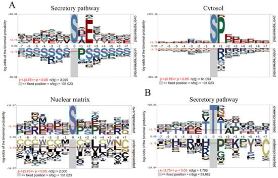 Analysis of the primary structure of human phosphosites in different subcellular localization. (A) pLogo of the primary structure of human Ser-phosphosites of proteins present in the secretory pathway, cytosol, or nuclear matrix, with a background dataset consisting of random human peptides of the same length. (B) pLogo of the primary structure of human Thr-phosphosites of proteins present in the secretory pathway, with a background dataset consisting of random human peptides of the same length.