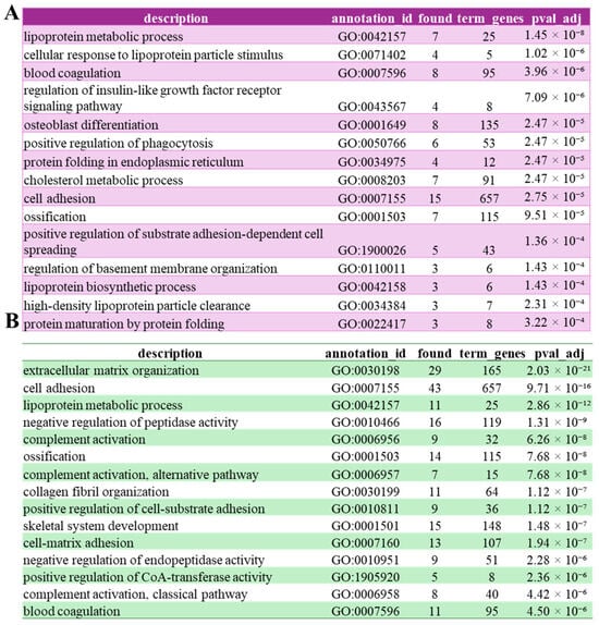 To gain insights into potential novel roles of FAM20C, we compared the functional annotations of the validated FAM20C substratome with those of our putative substratome. Gene ontology enrichment analysis of the validated FAM20C substratome revealed a strong association with biological processes related to lipid and lipoprotein metabolism. In particular, terms such as lipoprotein metabolic process, cholesterol metabolic process, and high-density lipoprotein particle clearance highlight a potential role of FAM20C in regulating lipid homeostasis. Processes including blood coagulation, ossification, and osteoblast differentiation are consistent with the known involvement of FAM20C in biomineralization and extracellular protein phosphorylation. Additional enriched terms, such as protein folding in the endoplasmic reticulum and protein maturation by protein folding, point to a link between FAM20C activity and secretory protein quality control and processing. GO Biological functions analysis of the putative substratome revealed an enrichment that expands the biological scope of FAM20C-associated processes. In addition to the pathways identified in the validated substratome, this extended dataset shows a strong overrepresentation of terms related to extracellular matrix organization, collagen fibril organization, cell adhesion, and cell–matrix interactions, highlighting an even broader involvement of FAM20C in extracellular structural dynamics. Moreover, the enrichment of complement activation (classical and alternative pathways) and negative regulation of peptidase and endopeptidase activity suggests a possible role for FAM20C in modulating immune and proteolytic processes within the extracellular environment. The persistence of terms such as ossification, skeletal system development, and blood coagulation further reinforces the functional link between FAM20C and key secretory and extracellular pathways (Figure 4B). Regarding collagen fibril organization, a previous study in which FAM20C was selectively inactivated in Type I collagen-expressing cells demonstrated that collagen fibrils in FAM20C-deficient bone were disorganized and abnormally thick []. These findings support our analysis suggesting a direct or indirect role for FAM20C in regulating collagen fibril organization.
