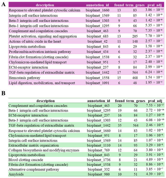 BioPlanet pathway enrichment (Figure 5) confirmed that FAM20C substrates are predominantly involved in extracellular and secretory functions. In the validated substratome, pathways such as integrin-mediated cell surface interactions and ECM–receptor interaction, were most prominently represented. In contrast, within the expanded putative substratome, the complement and coagulation pathways, already detected in the validated substratome but ranked only fifth, emerged among the top enriched categories, suggesting that FAM20C may influence these processes more extensively than previously appreciated. This dataset also revealed additional enrichment for TGF-β regulation of the extracellular matrix and other fibrotic processes, together with collagen biosynthesis and modifying enzymes, extracellular matrix organization, and amyloid-related processes. These results point to an extended regulatory role for FAM20C in extracellular protein remodeling and homeostasis. Overall, these findings reinforce the link between FAM20C-dependent phosphorylation and the coordinated regulation of matrix dynamics, coagulation, and immune pathways in the secretory environment. Although the involvement of FAM20C in blood coagulation has been previously suggested, particularly through the phosphorylation of von Willebrand factor (VWF), which enhances its adhesiveness to platelets in vitro [], our analysis indicates that this role may be far more extensive than previously appreciated. Interestingly, a mild coagulation defect was incidentally observed during surgery in a patient with Raine syndrome [], the autosomal recessive disorder caused by FAM20C mutations [], further supporting a possible functional link between FAM20C and coagulation pathways. Regarding the complement components, while only a few complement factors have been previously validated as FAM20C substrates, our analysis reveals a substantial expansion in the number of complement components identified as potential targets of the kinase, spanning both the classical and alternative pathways. Figure S1 visually illustrates the differences between the validated and putative substratome within the coagulation and complement pathways, with FAM20C identified substrates highlighted in red.