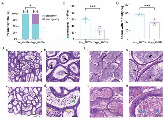 Cryptorchidism-induced spermatogenic dysfunction at PND70. (A) Fertility assessment in sexually mature mice (n = 15 per group). (B,C) Sperm parameters including sperm counts and sperm with motility (n = 5 per group). (D,E) Representative H&E staining of epididymal sections from prepubertal and sexually mature mice. The arrows indicate degenerated/necrotic cells (yellow), detached epithelial cells (green split-tailed), pyknotic nuclei (blue), karyorrhexis (blue split-tailed), and fibrotic interstitium (orange): Scale bars: 100 µm (a,c); 50 µm (b,d). Data are presented as mean ± SD. Statistical analysis was performed using unpaired t-test. * p < 0.05, *** p < 0.001 vs. control. Abbreviations: Crypt, cryptorchidism; Con, control; PND, postnatal day.