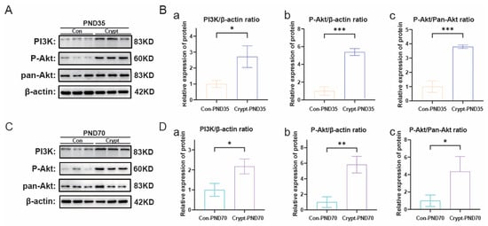 Cryptorchidism-induced activation of PI3K-Akt signaling. (A) Western blot analysis of PI3K, P-Akt, and Pan-Akt protein expression in prepubertal testes (PND35). (B) Quantification of PI3K-Akt pathway proteins in PND35 testes: (a) PI3K/β-actin ratio; (b) P-Akt/β-actin ratio; (c) P-Akt/Pan-Akt ratio. (C) Western blot analysis of PI3K, P-Akt, and Pan-Akt protein expression in sexually mature testes (PND70). (D) Quantification of PI3K-Akt pathway proteins in PND70 testes: (a) PI3K/β-actin ratio; (b) P-Akt/β-actin ratio; (c) P-Akt/Pan-Akt ratio. Data are presented as mean ± SD from three independent experiments. Statistical analysis: unpaired Student’s t-test. * p < 0.05, ** p < 0.01, *** p < 0.001 vs. the control. Abbreviations: Crypt, cryptorchidism; Con, control; PND, postnatal day.