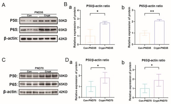 Cryptorchidism-induced activation of NF-κB signalling. (A) Western blot analysis of P50 and P65 protein expression in prepubertal testes (PND35). (B) Quantification of NF-κB subunits in PND35 testes: (a) P50/β-actin ratio; (b) P65/β-actin ratio. (C) Western blot analysis of P50 and P65 protein expression in sexually mature testes (PND70). (D) Quantification of NF-κB subunits in PND70 testes: (a) P50/β-actin ratio; (b) P65/β-actin ratio. Data are presented as mean ± SD from three independent experiments. Statistical analysis: unpaired Student’s t-test. * p < 0.05, ** p < 0.01 vs. the control. Abbreviations: Crypt, cryptorchidism; Con, control; PND, postnatal day.