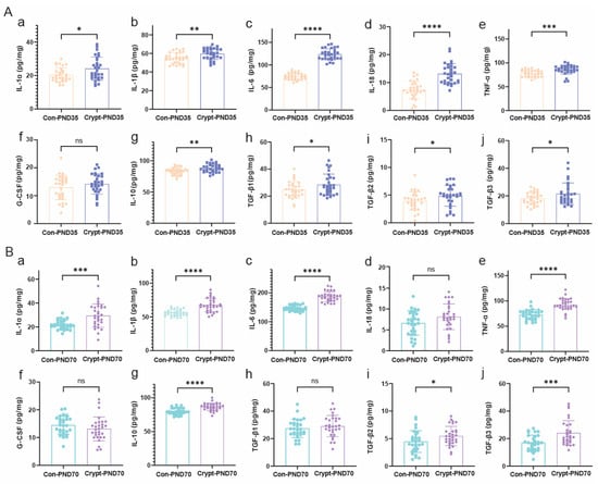 Phase-specific cytokine profiles in cryptorchid testes. ELISA quantification of cytokine levels in testicular tissues at (A) prepubertal (PND35) and (B) sexually mature (PND70) stages. Proinflammatory cytokines: (a) IL-1α; (b) IL-1β; (c) IL-6; (d) IL-18; (e) TNF-α. Anti-inflammatory cytokines: (f) G-CSF; (g) IL-10; (h) TGF-β1; (i) TGF-β2; (j) TGF-β3. Each group consisted of 30 testicular samples (bilateral testes from 15 mice per group). Data are presented as mean ± SD from three independent experiments. Statistical analysis: unpaired Student’s t-test. * p < 0.05, ** p < 0.01, *** p < 0.001, **** p < 0.0001; ns, not significant. Abbreviations: Con, control; Heat, heat-induced cryptorchidism; PND, postnatal day.