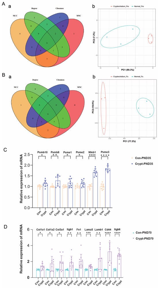Identification and validation of phase-specific key genes in cryptorchidism. (A,B) Key genes identified by PPI network analysis and PCA clustering in prepubertal and sexually mature testes, respectively ((a) network analysis; (b) PCA plot). (C,D) qRT-PCR validation of key gene expression in prepubertal (PND35) and sexually mature (PND70) testes (n = 9 per group). The values represent the means ± SEMs from three independent experiments. Statistical analysis was performed using unpaired t-test. * p < 0.05, ** p < 0.01, *** p < 0.001, **** p < 0.0001 vs. the control. Abbreviations: Crypt, cryptorchidism; Con, control; PND, postnatal day.