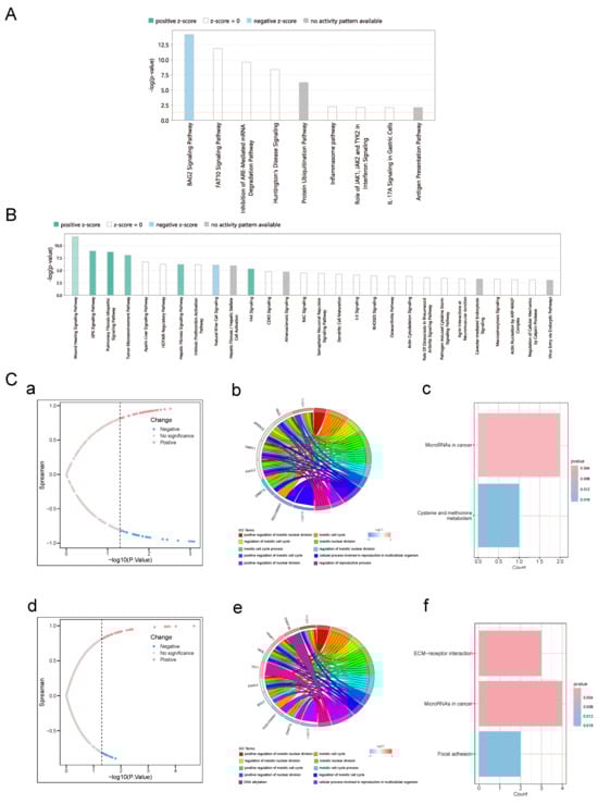 Ingenuity pathway analysis revealed distinct oncogenic pathway signatures between developmental phases (Figure 8A,B). In prepubertal testes, Pre-key genes showed selective pathway inhibition, most notably BAG2 signaling pathway suppression (Z-score = −2.1), alongside moderate activation of protein ubiquitination and EIF4 signaling pathways. In contrast, sexually mature testes exhibited broad oncogenic pathway activation, with Mat-key genes significantly upregulating multiple cancer-associated pathways including PI3K-Akt signaling, MAPK cascades, cell cycle regulation, and DNA repair mechanisms (Figure 8B). Correlation analysis with established germ cell cancer (GC) genes identified phase-specific oncogenic signatures with distinct mechanistic implications (Figure 8C). Prepubertal oncogenic associations centered on metabolic reprogramming and epigenetic regulation, with significant enrichment in cysteine/methionine metabolism and cancer-related microRNAs (Figure 8C(a–c)). Mature-phase oncogenic signatures focused on structural remodeling and invasion pathways, showing pronounced enrichment in ECM-receptor interactions, focal adhesion complexes, and microRNAs in cancer (Figure 8C(d–f)). These findings suggest that cryptorchidism-induced molecular alterations engage distinct oncogenic mechanisms depending on developmental timing.