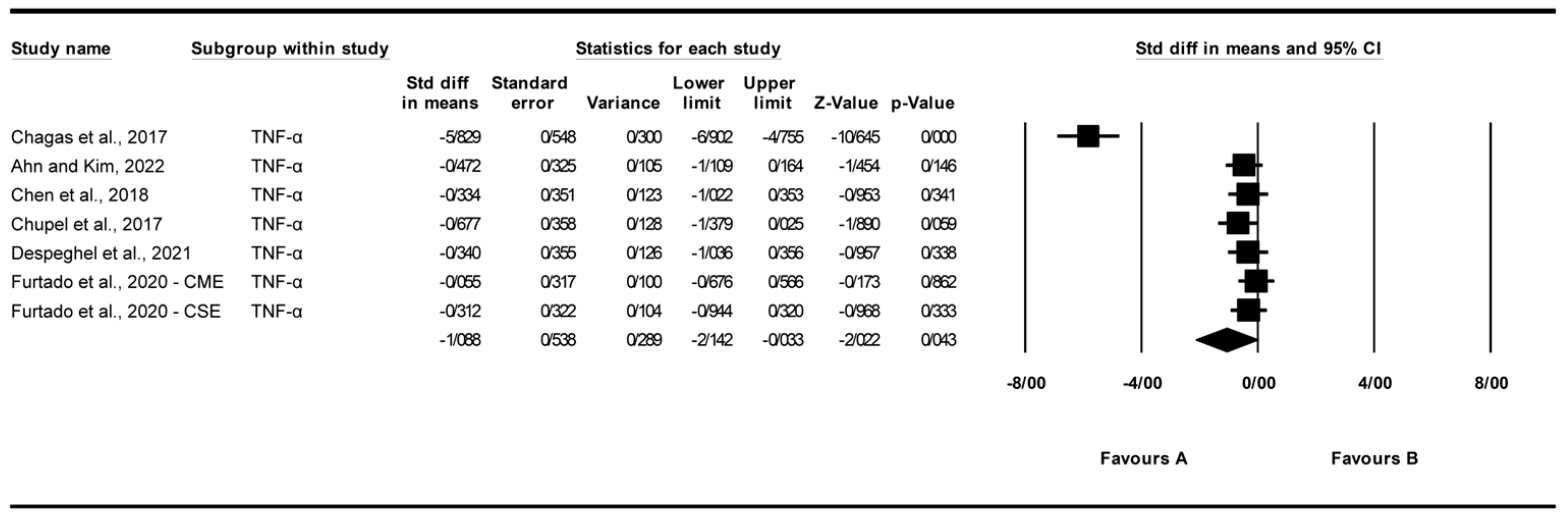 3.4.5. Effect of Exercise on Tumor Necrosis Factor-Alpha (TNF-α) Levels