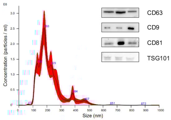Characterization of plasma extracellular vesicles. Nanoparticle tracking analysis (NTA) showing the size distribution and concentration of isolated plasma EVs, with the majority of particles ranging between 100–200 nm. Western blot (File S1) analysis confirms the expression of EV-enriched markers CD63, CD9, CD81, and TSG101, supporting the identity of the isolated EV population.