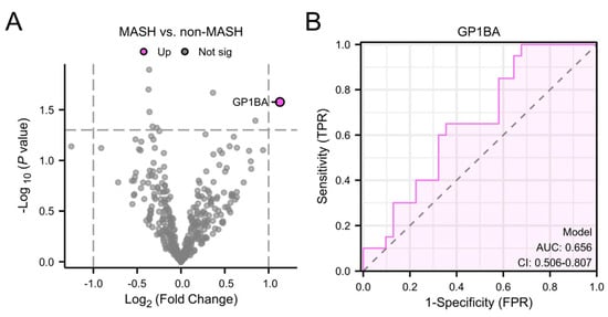 Volcano plot showing differentially abundant plasma EV proteins between participants with MASH and those without steatohepatitis (A) and Receiver operating characteristic (ROC)-curve of GP1BA for distinguishing between MASH from MASLD without steatohepatitis (B). MASH, metabolic dysfunction-associated steatohepatitis; TPR, true positive rate; AUC, area under the curve; CI, confidence interval; FPR, false positive rate; GP1BA, glycoprotein Ib alpha chain.