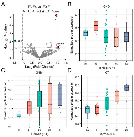 Supplementary Table S2 shows participants characteristics of participants with F0-F1 (n = 13) and ≥F3 (n = 23) fibrosis. After adjusting for multiple comparisons, complement component 7 (C7) remained statistically significant between F0-F1 vs. ≥F3 (log2 fold change = 0.95, adjusted p = 0.002). Additionally, immunoglobulin heavy constant delta (IGHD) and guanine nucleotide-binding protein subunit beta-1 (GNB1) were identified as nominally significant (|log2 fold change| > 1, unadjusted p < 0.05; Figure 4A). Notably, IGHD expression decreased with advancing stages of fibrosis (Figure 4B), whereas GNB1 and C7 levels increased (Figure 4C,D).