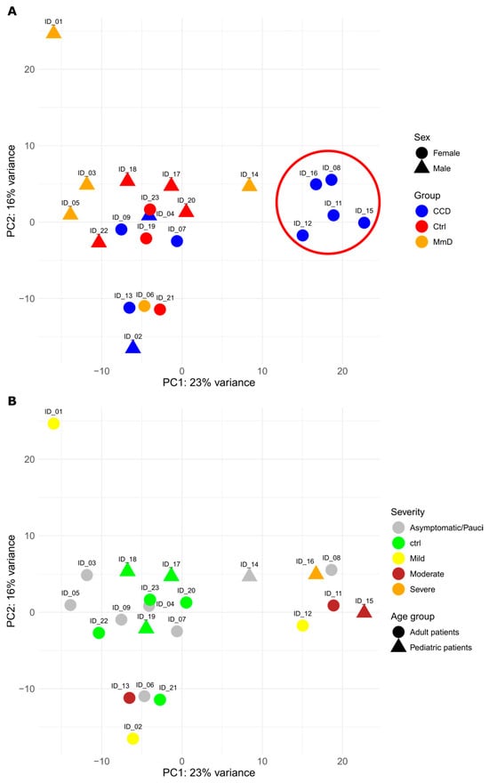 (A) The graph displays patients described by the first two principal components, which account for 37% of the variability. CCD patients are represented in blue, MmD patients in orange, and healthy controls in red. Sex groups are differentiated by geometric shapes. A subgroup of female CCD patients appears to cluster distinctly within the PCA plot, as highlighted by the encircled region. (B) PCA with alternative colour coding (severity and age group). The graph displays patients described by the first two principal components, which account for 37% of the variability. Age groups are differentiated by geometric shapes, with paediatric patients (<12 years) and adult patients (≥12 years) represented by distinct markers. The colours correspond to the severity of the disease: grey for asymptomatic individuals, green for healthy controls, yellow for mild myopathy, brown for moderate myopathy, and orange for severe myopathy.