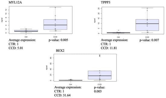 In this section, we first performed a transcriptional profile analysis comparing all CCD patients to controls, adjusted for sex and age, using DESeq2. This analysis identified 221 differentially expressed genes (DEGs, p-adj < 0.05 and log2FC greater than 0.58 or less than −0.58), of which 143 were up-regulated (Figure 2, Table S3). We then conducted an in silico validation analysis focusing on the subgroup of patients, referred to as CL5 CCD, who exhibited a distinct gene expression pattern based on principal component analysis. Comparing the transcriptional profile of CL5 CCD patients to controls, we identified 735 DEGs. Of these, 367 were up-regulated and 368 down-regulated (Table S4). This step aimed to assess the consistency of DEGs between the full CCD cohort and the CL5 CCD subgroup, in order to determine whether the more pronounced transcriptional changes observed in the CL5 patients were representative of the broader CCD group. Among the 160 DEGs shared between the two analyses (all CCD vs. controls and CL5 CCD vs. controls), the top three in terms of statistical significance were as follows: myosin light chain 12A (MYL12A, p-adj = 4.32 × 10−14, log2FC = 1.591 and p-adj = 1.06 × 10−26, log2FC = 2.05, respectively), tubulin polymerisation promoting protein family member 3 (TPPP3, p-adj = 9.07 × 10−12, log2FC = 2.01 and p-adj = 6.00 × 10−28, log2FC = 2.93), and brain expressed X-linked 2 (BEX2, p-adj = 2.41 × 10−09, log2FC = 1.79 and p-adj = 5.00 × 10−12, log2FC = 3.25). These genes are potentially involved in mitochondrial dynamics, promoting mitochondrial fission [] and mitophagy [], although their precise roles remain to be fully elucidated. Validation via RT-qPCR confirmed their differential expression (p = 0.005, 0.007, and 0.003, respectively, Figure 3). The findings reinforced the consistency between the two analyses and support the hypothesis that the CL5 CCD subgroup is representative of the broader CCD population.