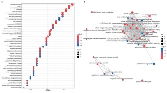 (A) Dotplot showing the top 50 Gene Ontology (GO) terms according to the gene ratio (DEGs related to a GO term/total number of genes of the GO term). The colours represent the p-value adjusted according to the HB method (p-adj, as in the legend), and the dots’ size indicates the number of genes involved in each pathway. (B) Dotplot showing existing relationships among the 50 most significant enriched GO terms (p-adj) resulting from over-representation analysis. For graphical reasons, not all labels corresponding to the muscle function and muscle physiology macrocategory are displayed.