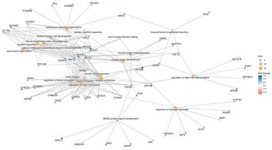 DEGs identified in the CCD vs. control comparison were analysed using GO-ORA, identifying 62 significantly enriched GO terms (Figure 5A, Table S10). The most significantly enriched pathways were primarily related to muscle function and physiology. Interestingly, several unexpected pathways also emerged, including response to reactive oxygen species, SMAD protein signal transduction, response to hydrogen peroxide, and positive regulation of miRNA transcription. Notably, these pathways form a distinct cluster, as visible in the emaplot generated for the 50 most significant GO terms (Figure 5B). The relationships among genes within each pathway are illustrated in the category netplot (Figure 6).