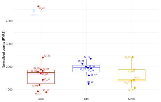 Normalised RYR1 gene count distribution across phenotypic subgroups. The data are presented as boxplots indicating the distribution of normalised RYR1 counts. Each observation is plotted as a point within its respective group: patients with CCD in red, Ctrl in blue, and MmD in yellow. The y-axis denotes the normalised counts for RYR1, facilitating a visual comparison of expression differences among the groups.