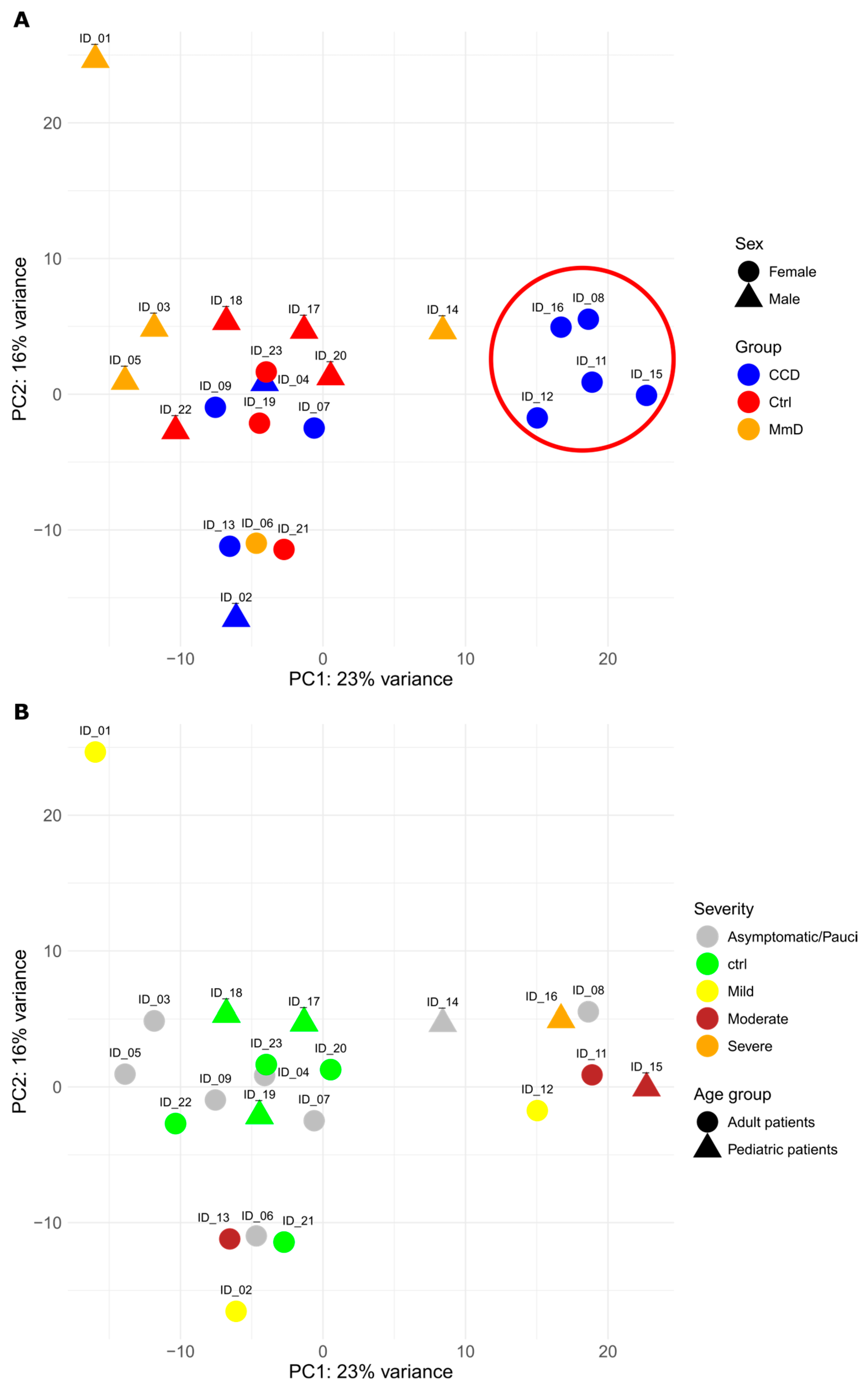 Figure 1. (A) The graph displays patients described by the first two principal components, which account for 37% of the variability. CCD patients are represented in blue, MmD patients in orange, and healthy controls in red. Sex groups are differentiated by geometric shapes. A subgroup of female CCD patients appears to cluster distinctly within the PCA plot, as highlighted by the encircled region. (B) PCA with alternative colour coding (severity and age group). The graph displays patients described by the first two principal components, which account for 37% of the variability. Age groups are differentiated by geometric shapes, with paediatric patients (<12 years) and adult patients (≥12 years) represented by distinct markers. The colours correspond to the severity of the disease: grey for asymptomatic individuals, green for healthy controls, yellow for mild myopathy, brown for moderate myopathy, and orange for severe myopathy.