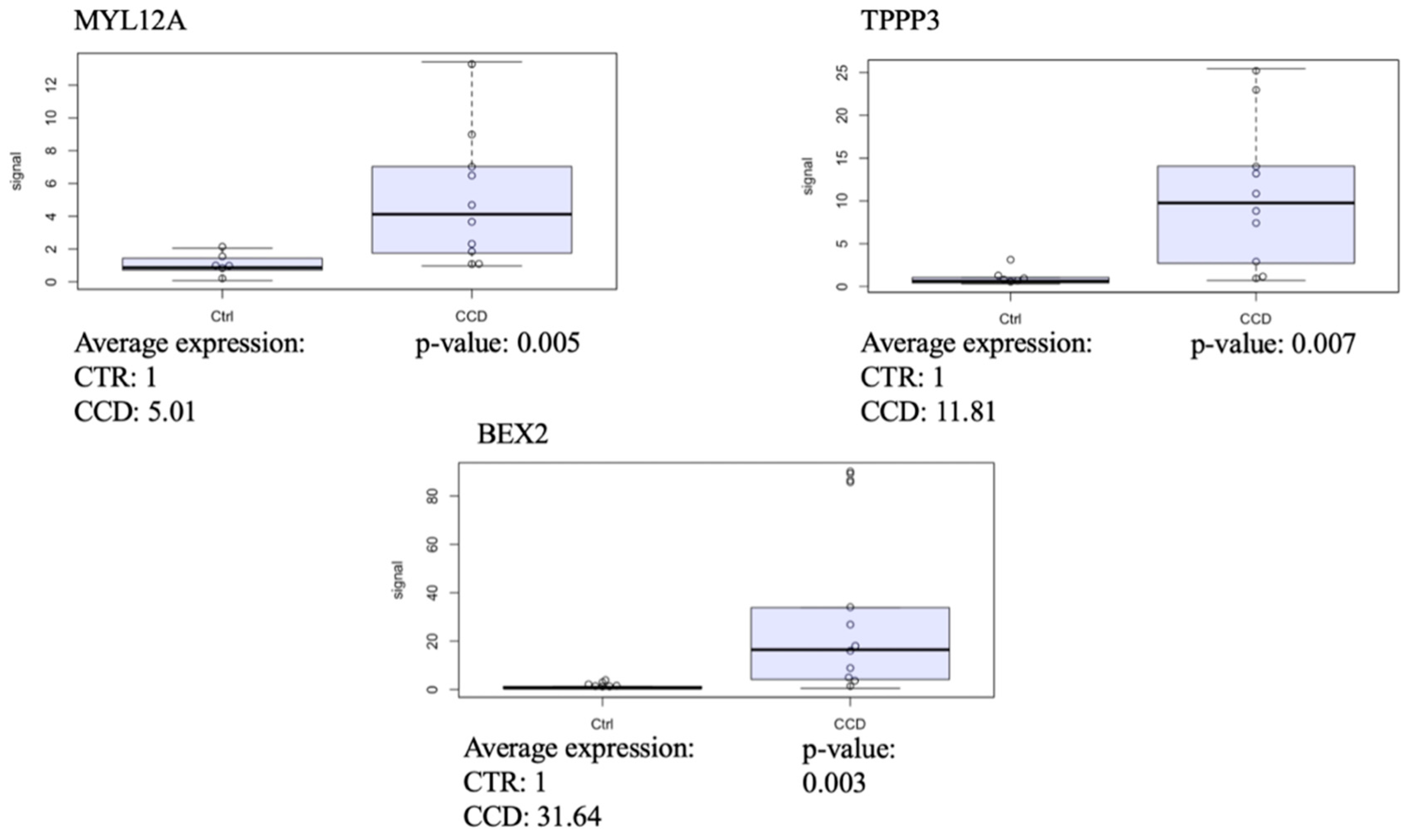 In this section, we first performed a transcriptional profile analysis comparing all CCD patients to controls, adjusted for sex and age, using DESeq2. This analysis identified 221 differentially expressed genes (DEGs, p-adj < 0.05 and log2FC greater than 0.58 or less than −0.58), of which 143 were up-regulated (Figure 2, Table S3). We then conducted an in silico validation analysis focusing on the subgroup of patients, referred to as CL5 CCD, who exhibited a distinct gene expression pattern based on principal component analysis. Comparing the transcriptional profile of CL5 CCD patients to controls, we identified 735 DEGs. Of these, 367 were up-regulated and 368 down-regulated (Table S4). This step aimed to assess the consistency of DEGs between the full CCD cohort and the CL5 CCD subgroup, in order to determine whether the more pronounced transcriptional changes observed in the CL5 patients were representative of the broader CCD group. Among the 160 DEGs shared between the two analyses (all CCD vs. controls and CL5 CCD vs. controls), the top three in terms of statistical significance were as follows: myosin light chain 12A (MYL12A, p-adj = 4.32 × 10−14, log2FC = 1.591 and p-adj = 1.06 × 10−26, log2FC = 2.05, respectively), tubulin polymerisation promoting protein family member 3 (TPPP3, p-adj = 9.07 × 10−12, log2FC = 2.01 and p-adj = 6.00 × 10−28, log2FC = 2.93), and brain expressed X-linked 2 (BEX2, p-adj = 2.41 × 10−09, log2FC = 1.79 and p-adj = 5.00 × 10−12, log2FC = 3.25). These genes are potentially involved in mitochondrial dynamics, promoting mitochondrial fission [48] and mitophagy [49], although their precise roles remain to be fully elucidated. Validation via RT-qPCR confirmed their differential expression (p = 0.005, 0.007, and 0.003, respectively, Figure 3). The findings reinforced the consistency between the two analyses and support the hypothesis that the CL5 CCD subgroup is representative of the broader CCD population.