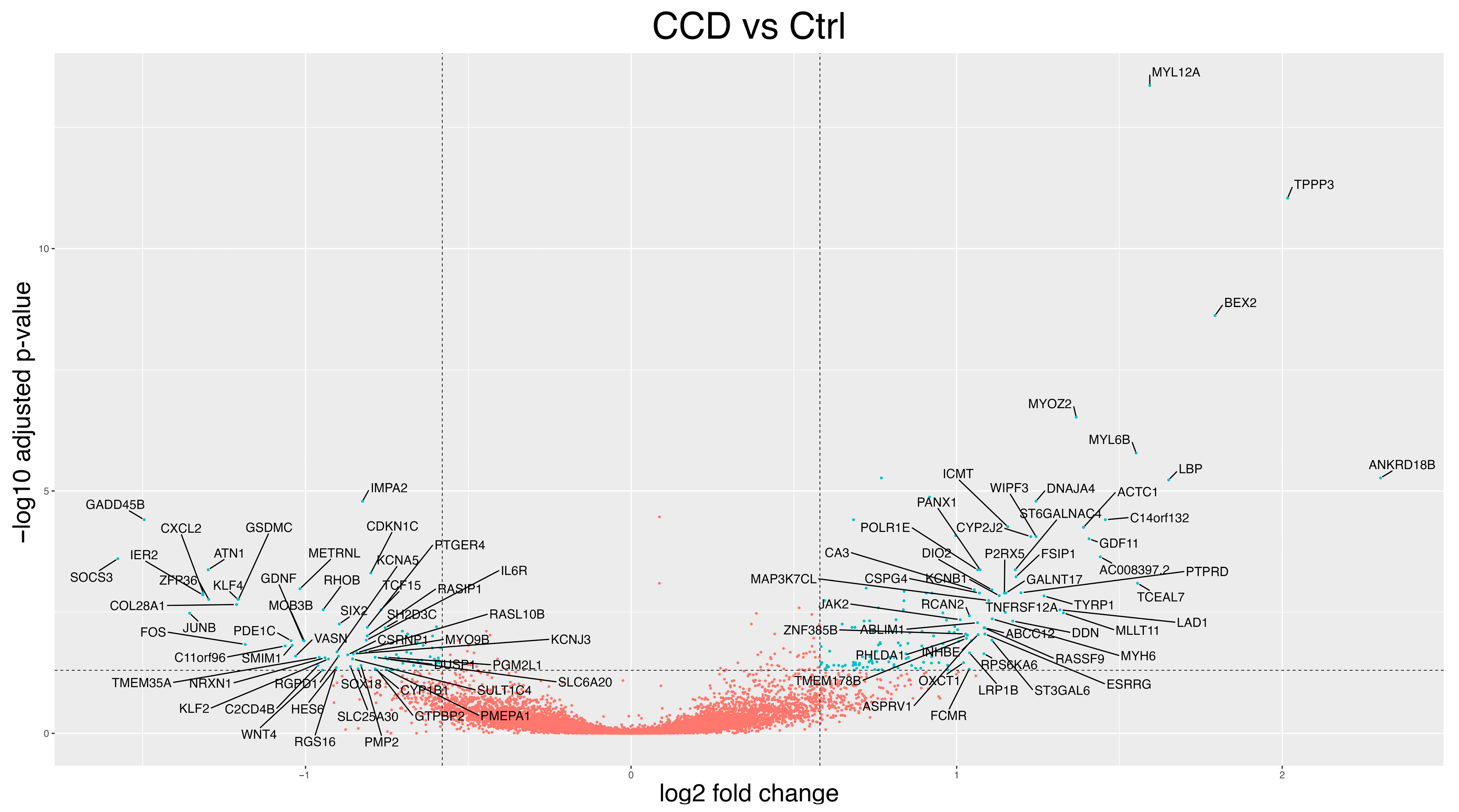 Figure 3. Differential expression analysis of CCD vs. controls using DESeq2. Each dot represents a gene, plotted according to its log2FC on the X-axis and the −log10 adjusted p-value on the Y-axis. Blue dots indicate DEGs (p-adj < 0.05 with a log2FC ≥ 0.58 or ≤−0.58). DEGs were labeled (only a subset of the most dysregulated genes was shown for readability).
