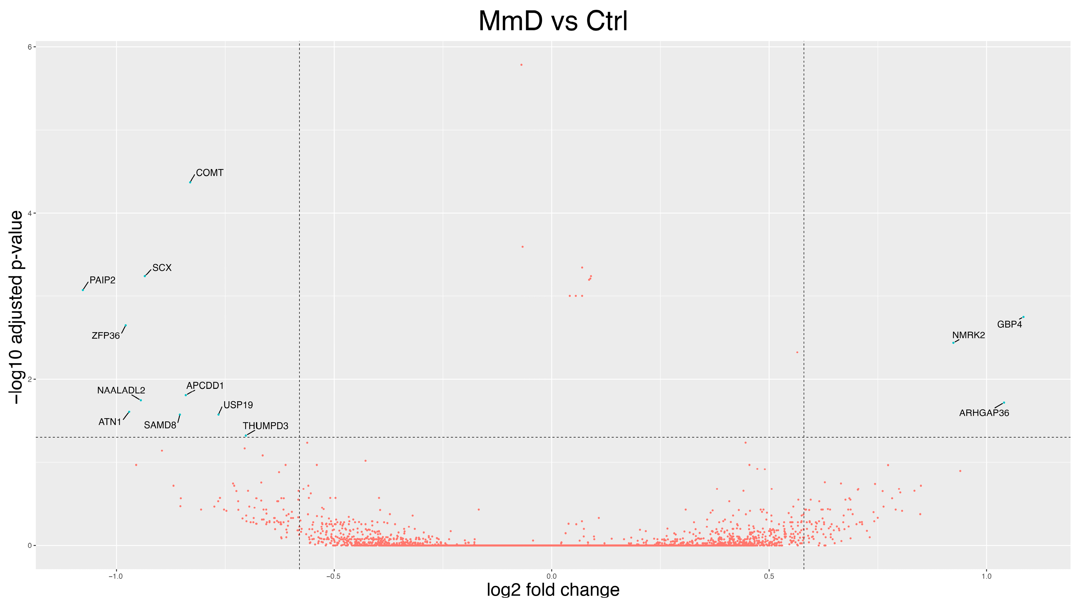 Figure 4. Volcano plot showing the results of differential expression analysis of MmD vs. controls using DESeq2. Each dot represents a gene, plotted according to its log2FC on the X-axis and the −log10 adjusted p-value on the Y-axis. Blue dots indicate DEGs (p-adj < 0.05 with a log2FC ≥ 0.58 or ≤−0.58). DEGs were labeled.