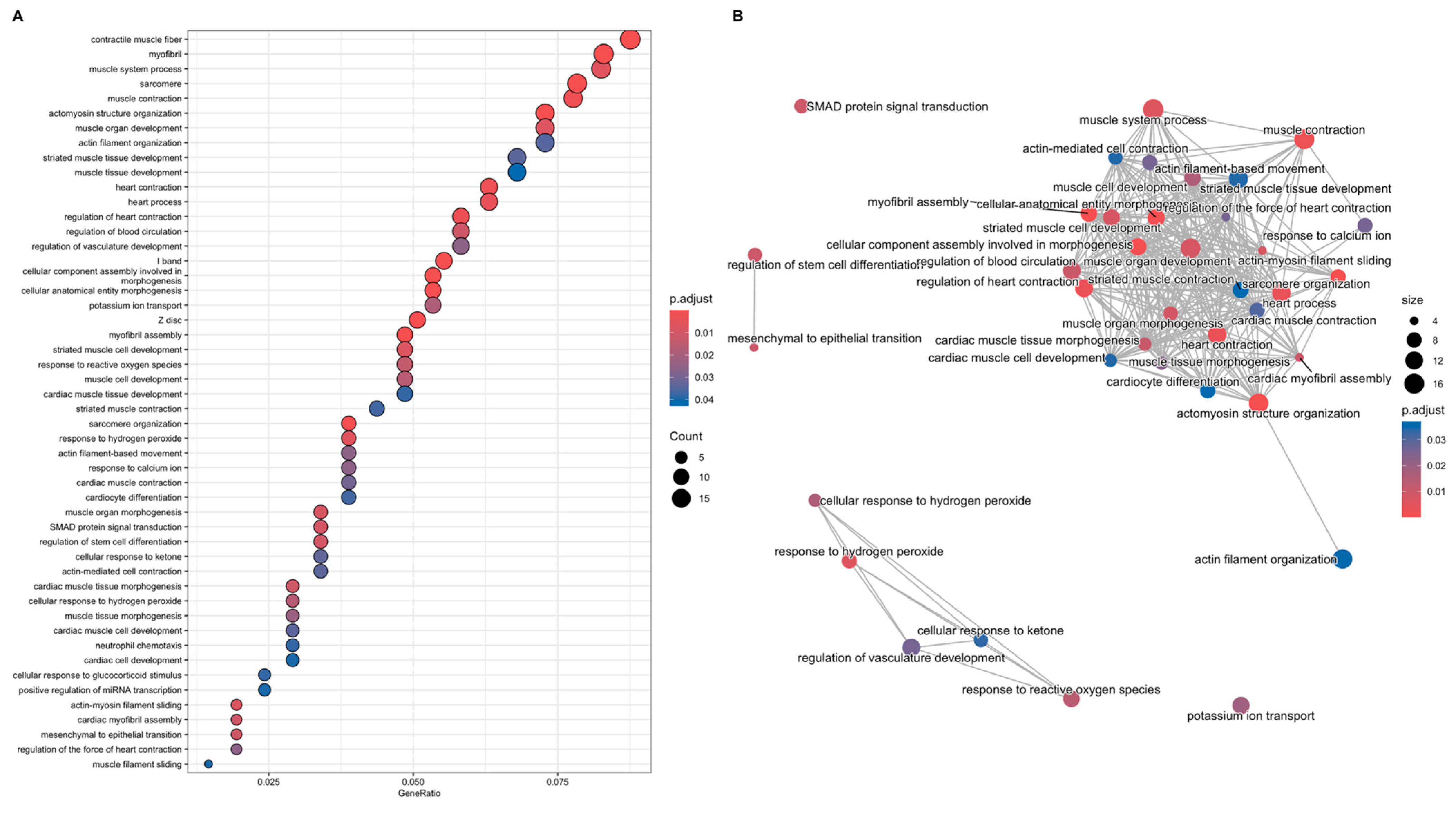 Figure 5. (A) Dotplot showing the top 50 Gene Ontology (GO) terms according to the gene ratio (DEGs related to a GO term/total number of genes of the GO term). The colours represent the p-value adjusted according to the HB method (p-adj, as in the legend), and the dots’ size indicates the number of genes involved in each pathway. (B) Dotplot showing existing relationships among the 50 most significant enriched GO terms (p-adj) resulting from over-representation analysis. For graphical reasons, not all labels corresponding to the muscle function and muscle physiology macrocategory are displayed.