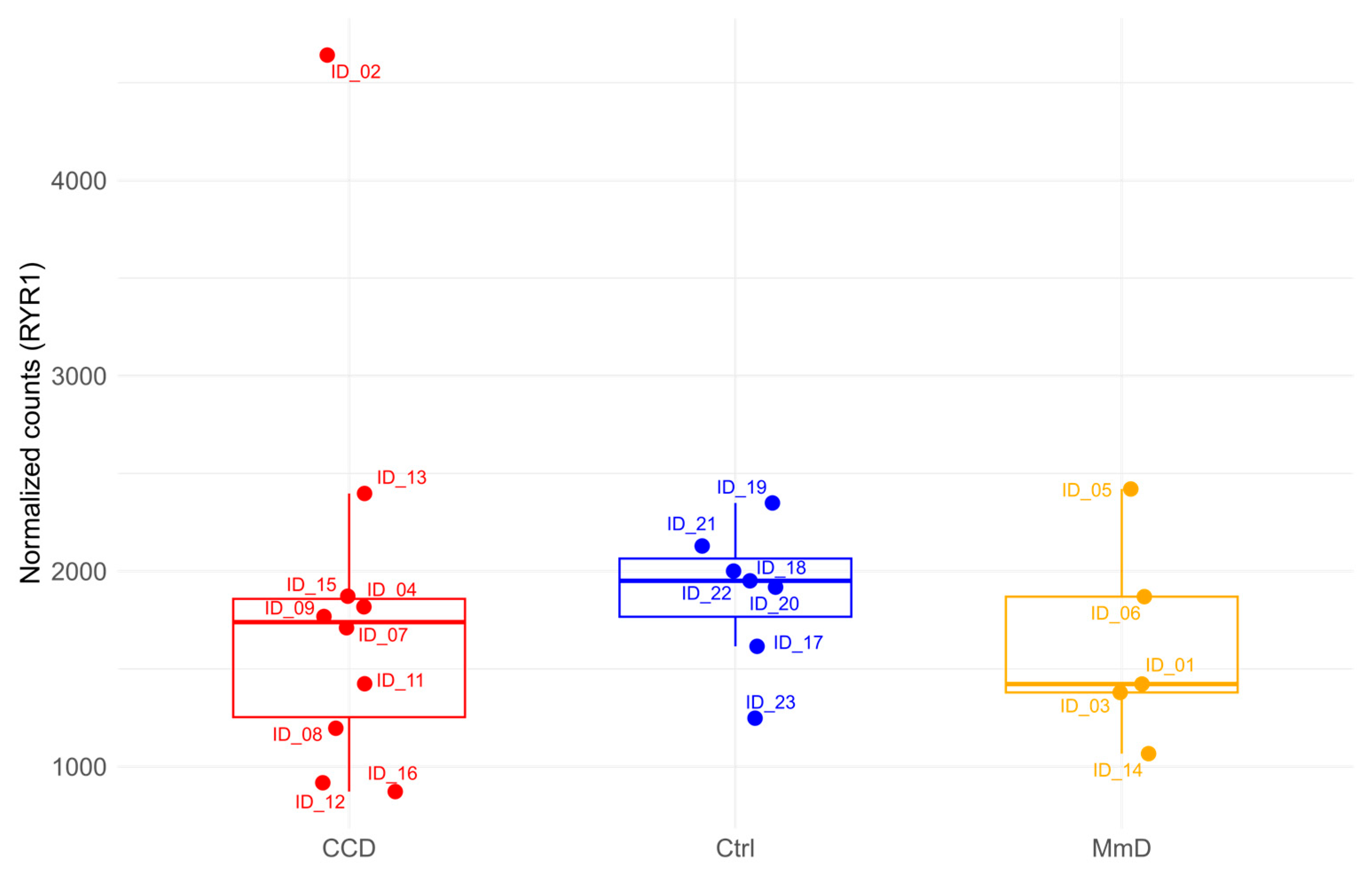 Figure 7. Normalised RYR1 gene count distribution across phenotypic subgroups. The data are presented as boxplots indicating the distribution of normalised RYR1 counts. Each observation is plotted as a point within its respective group: patients with CCD in red, Ctrl in blue, and MmD in yellow. The y-axis denotes the normalised counts for RYR1, facilitating a visual comparison of expression differences among the groups.