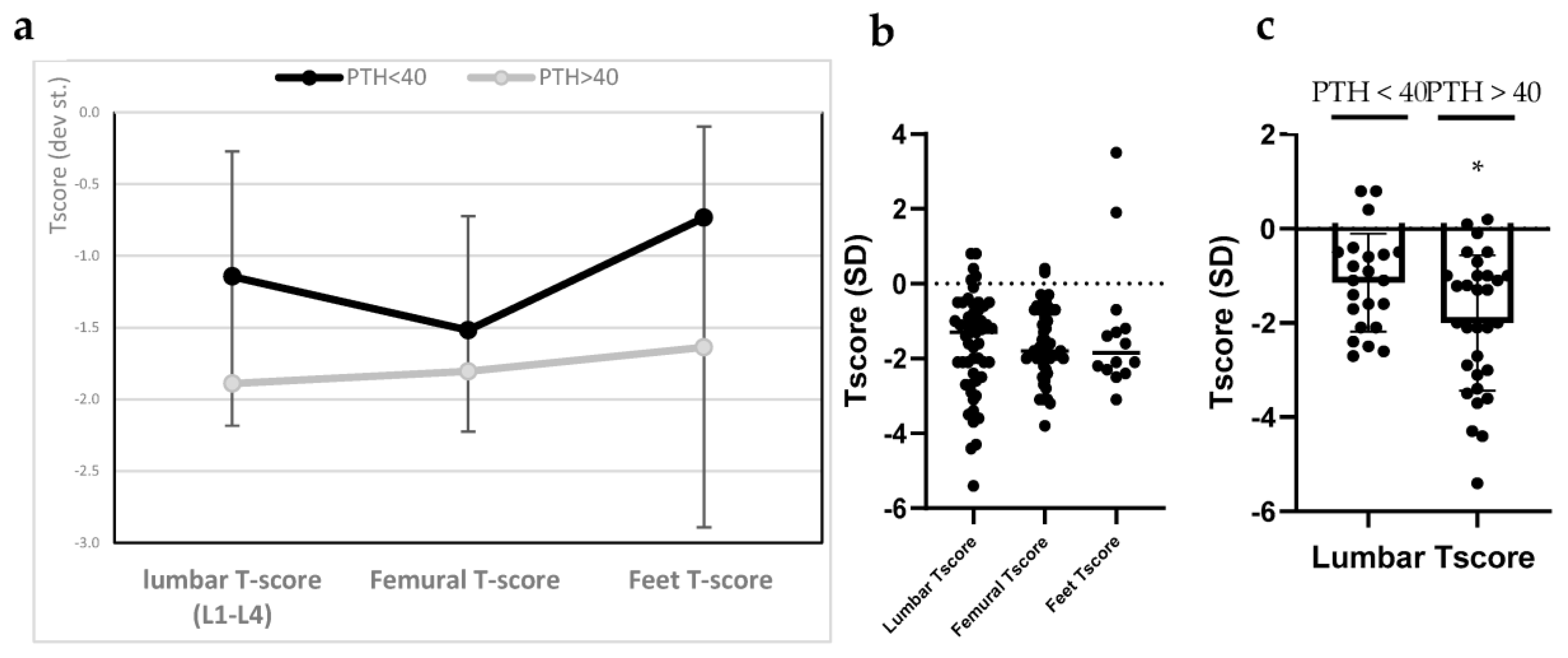 Figure 4. Comparison of T-scores across anatomical sites between patients with PTH ≤ 40 pg/mL and PTH > 40 pg/mL by t-test. (a) Line graph depicting mean T-scores (±SD) at the lumbar spine (L1–L4), femoral region, and feet in two groups stratified by serum PTH levels. Patients with PTH ≤ 40 pg/mL (black line) exhibited consistently higher T-scores at all measured skeletal sites compared to those with PTH > 40 pg/mL (gray line). The difference was most pronounced in the lumbar spine and foot measurements. (b) Bar graph showing the distribution of patients with osteopenia and osteoporosis at each anatomical site (lumbar spine, femur, feet), stratified by PTH levels; (c) Box plots illustrating the variation in T-scores across the three anatomical sites in the two PTH groups. Median T-scores were significantly lower in the subgroup of patients with PTH > 40 pg/mL (* = p ≤ 0.05 vs. PTH < 40 pg/mL subgroup).