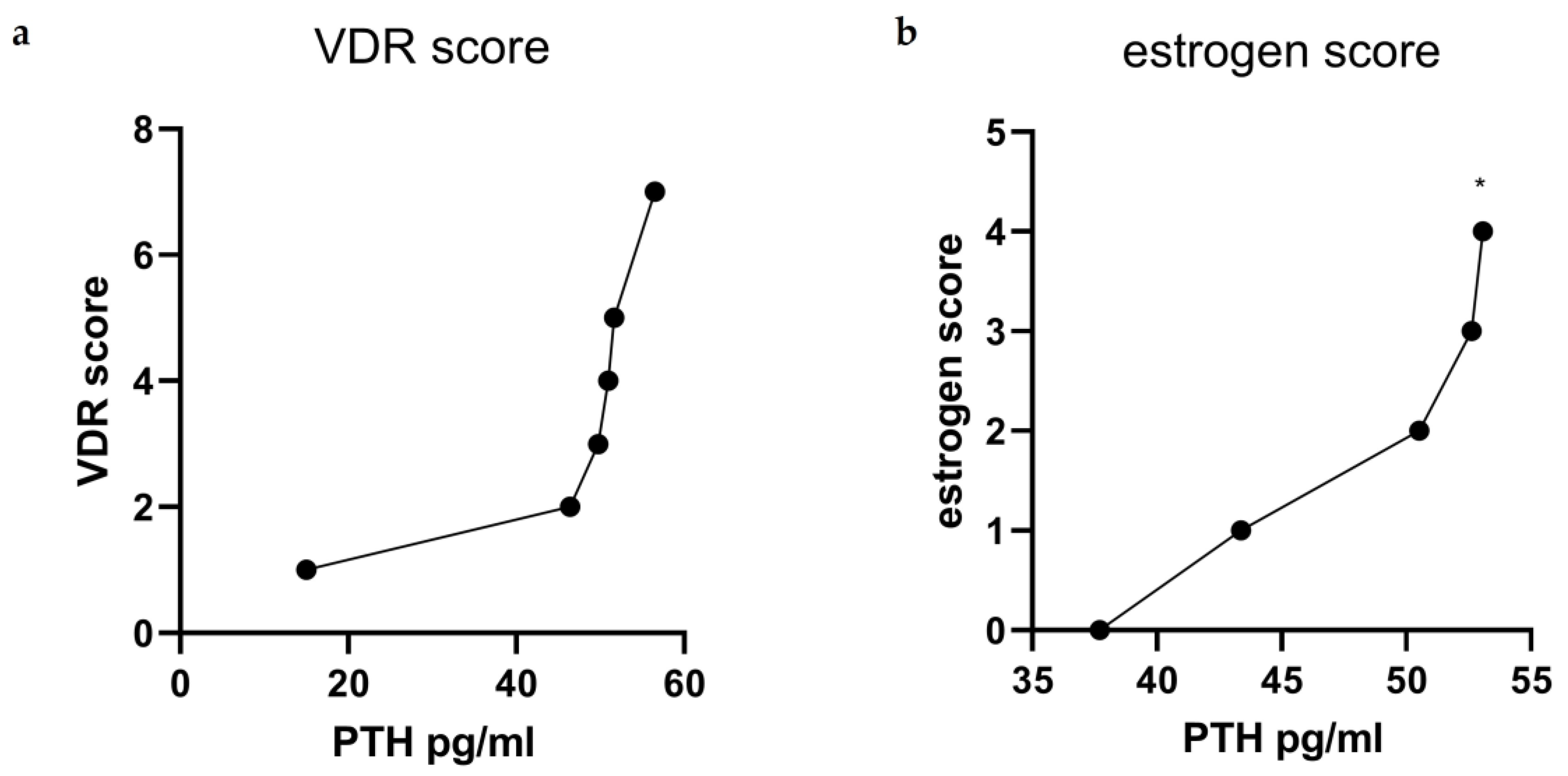 Figure 5. Relationship between cumulative genetic polymorphism burden and PTH levels. Patients were genotyped for six SNPs associated with VitD and estrogenic signaling: (a) VDR ApaI (rs64978), BsmI (rs63980), TaqI (rs1056), FokI (rs30920) and (b) ERα PvII (IVS1-397 T/C) and XbaI (IVS1-351 A/G). A cumulative polymorphism score was computed by assigning a value of 2 for altered homozygous polymorphic genotypes, 1 for heterozygous, and 0 for wild-type at each locus. The sum of all scores was then plotted against serum PTH levels. The graph shows a positive trend between the number of genetic variants and PTH concentration, with a stepwise increase in mean PTH observed across score categories, both when PTH was plotted against VDR score (a) and against ER score (b). (* = p < 0.05 was considered statistically significant).
