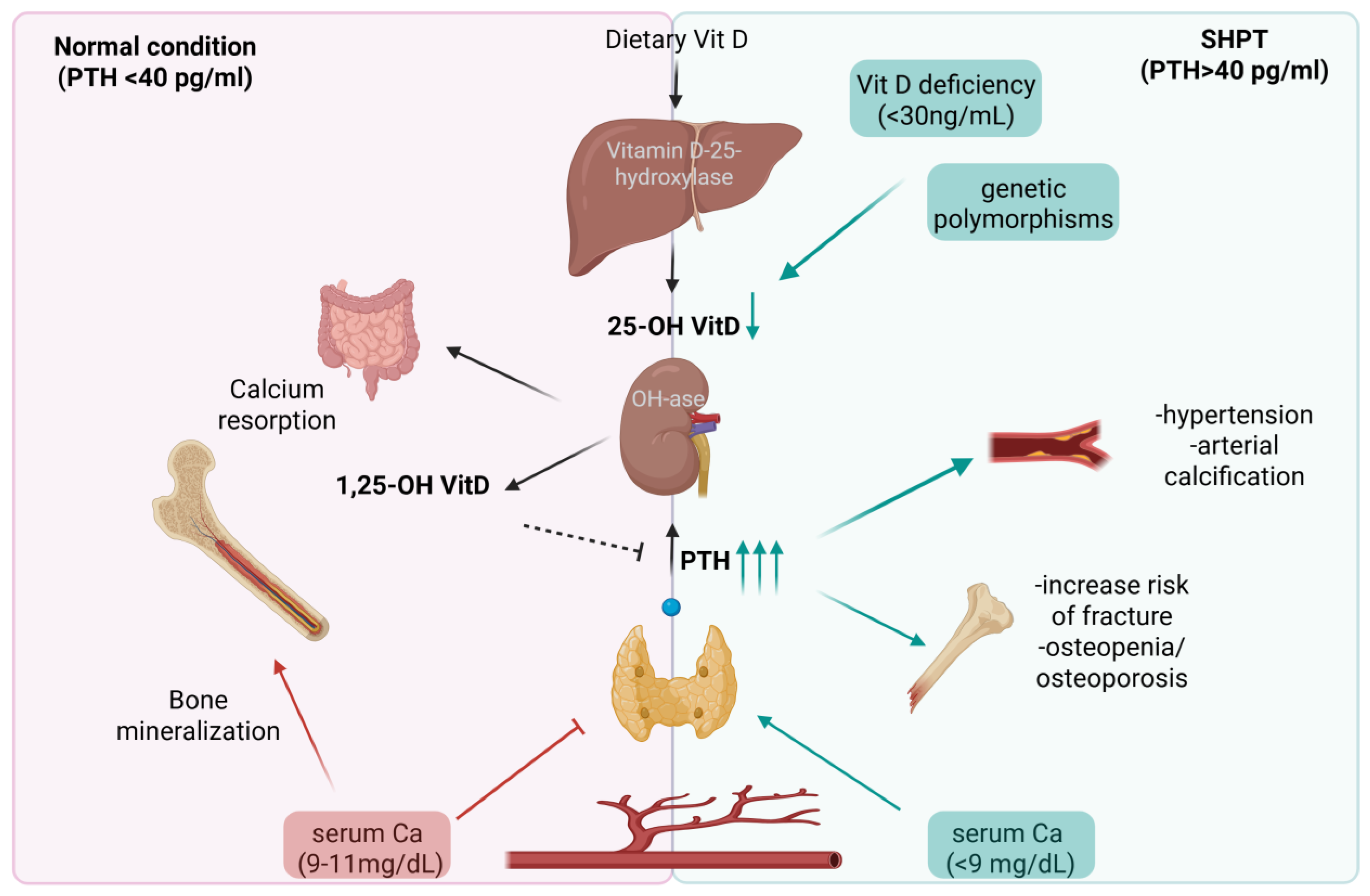 Figure 6. Schematic representation of the physiological differences between normal parathyroid hormone (PTH) levels and secondary hyperparathyroidism (SHPT). On the left, individuals with PTH < 40 pg/mL show normal calcium absorption from the gut, sufficient conversion of vitamin D into its active form (1,25-OH Vit D), proper bone mineralization, and stable serum calcium levels (9–11 mg/dL). On the right, SHPT (PTH > 40 pg/mL) is driven by vitamin D deficiency (<30 ng/mL) and genetic polymorphisms that enhance PTH secretion. This biochemical imbalance leads to reduced serum calcium (<9 mg/dL), increased bone resorption, and diminished bone mineral density, resulting in osteopenia, osteoporosis, and a higher risk of fractures. Moreover, elevated PTH is associated with hypertension and arterial calcification, underscoring its systemic impact. Overall, the illustration highlights the 40 pg/mL PTH threshold as a critical marker of bone fragility and cardiovascular risk, emphasizing the importance of monitoring and managing vitamin D status and PTH levels to maintain skeletal and systemic health. Created with Biorender.