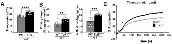 Sepsis involves an initial hyperinflammatory phase marked by the activation of platelets, leukocytes, and endothelial cells, and is followed by an immunosuppressive state characterized by immune cell dysfunction and death []. Early platelet activation corresponds with inflammation, while late platelet dysfunction is associated with immunosuppression and reflects the severity of sepsis []. Similarly to platelets, changes in responsiveness among peripheral blood innate immune cells in sepsis have been previously reported. Shalova et al. found that while septic monocytes show preserved phagocytic ability, there is significant attenuation of inflammatory cytokine response and antigen presentation to LPS, indicating endotoxin tolerance []. Likewise, septic neutrophils have shown reduced chemokine expression and chemotaxis in response to immune stimulation with fMLP (N-formyl-methionyl-leucyl-phenylalanine) []. We too previously found septic-induced functional alterations in circulating neutrophils. We demonstrated that although total blood leukocyte counts dropped in both WT and TLR7−/− septic mice, WT mice demonstrated reduced neutrophil migration to the peritoneum, a lower number of phagocytic neutrophils, and higher bacterial load in the blood compared to TLR7−/− septic mice []. These findings support our current observations of septic-induced platelet dysfunction mediated by TLR7. Excessive inflammation in sepsis creates an environment for the overactivation and functional exhaustion of peripheral innate immune cells, and TLR7 deficiency appears to be protective in this regard.