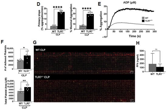 Our prior work demonstrates that TLR7 deficiency results in a protective effect against sepsis-induced thrombocytopenia [,]. To determine whether this extends to platelet function, we isolated platelets from TLR7−/− sham and CLP mice and evaluated both adhesive and aggregatory function compared to WT mice. It is noted that the aggregatory response of platelets from sham WT and TLR7−/− mice showed no difference in response to thrombin and ADP (Supplementary Materials Figure S3A,B) and showed no difference in the number (sham WT 3608 platelets vs. sham TLR7−/− 3162 platelets) or area (sham WT 4411 µM vs. sham TLR7−/− 4683 µM) of adhered platelets to collagen-coated channels, indicating no baseline differences in platelet function for WT and TLR7−/− sham mice. When compared with WT mice, TLR7−/− mice had moderately higher temperatures 24 h after CLP (26.8 ±1.1 °C vs. 33.1 ± 0.2.4 °C, p < 0.0001) (Figure 2A). Also, TLR7−/− CLP mice demonstrate improved aggregatory function in response to thrombin (Figure 2B,C) and ADP (Figure 2D,E) compared to WT CLP mice. Further, TLR7−/− mice show higher platelet adherence to immobilized collagen in terms of total number (4234 ± 461.8 platelets vs. 6589 ± 2048 platelets, p = 0.0117) and coverage area (6979 ± 1215 µM vs. 9719 ± 1781 µM, p = 0.0057) (Figure 2F,G) of platelets. Finally, there was no difference in soluble PF4 levels between WT and TLR7−/− CLP mice (185.8 ± 253.6 pg/mL vs. 115 ± 71.43 pg/mL, p = 0.2583) (Figure 2H). These results imply that TLR7 deficiency overall preserves, and even augments, platelet function in the setting of ongoing platelet activation in sepsis.