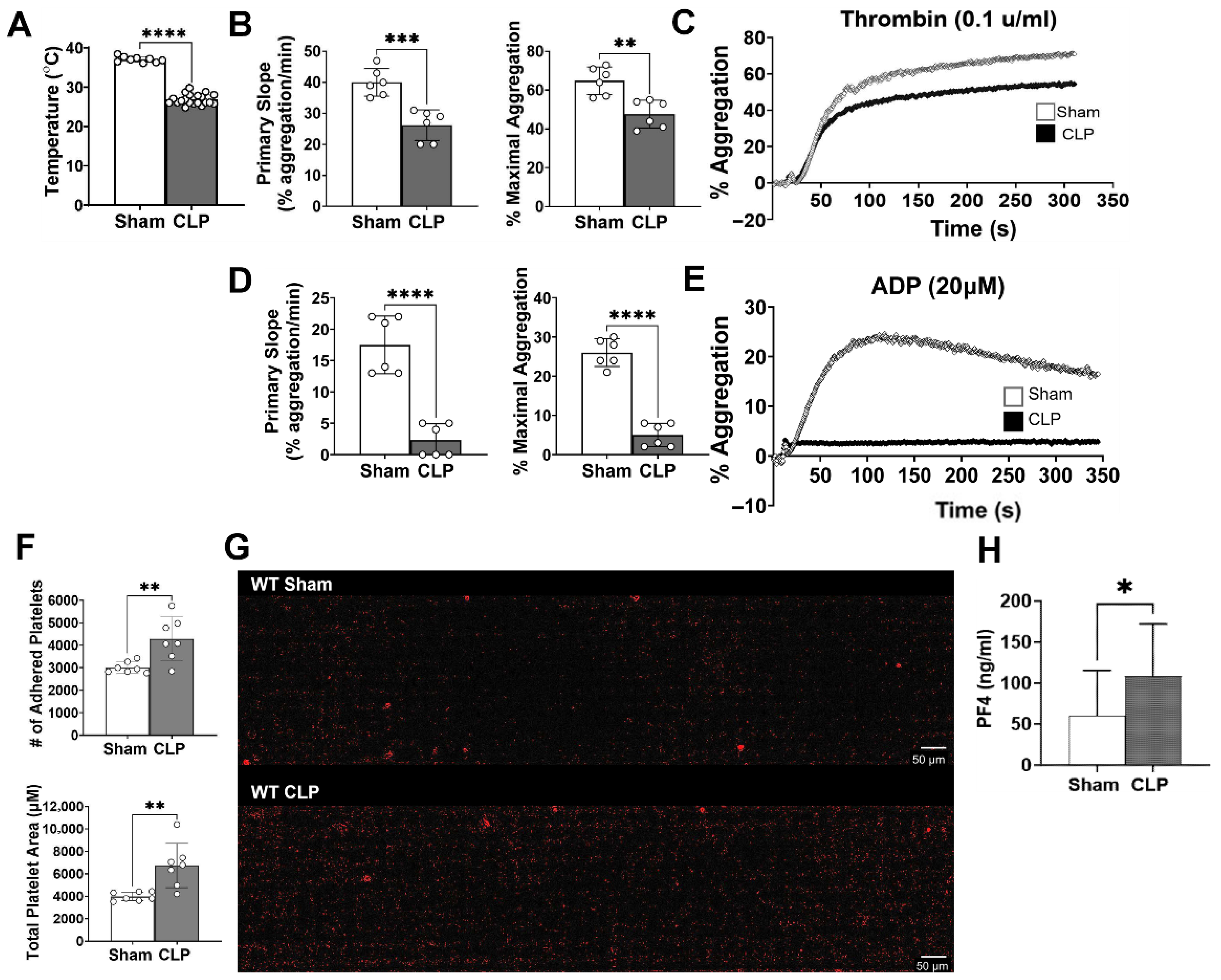 11] Possible reasons for this discrepancy may be due to the endpoint analyzed, soluble factor versus cell surface protein, and the significant sample variation we observed with the PF4 assay, limiting our ability to detect a difference due to inadequate sample size. Further, sex was considered as a biological variable in our studies; in our pilot studies utilizing female and male mice, global coagulation using viscoelastic testing following the CLP procedure was performed, but we noted that female mice demonstrated less perturbations in global coagulation dysfunction compared to males. Therefore, out of necessity for maintaining adequate severity to establish baseline coagulopathy and platelet dysfunction, we subsequently utilized male mice. Ketamine and xylazine were our primary anesthetics, and ketamine has been shown to impair platelet function. However, at standard recommended doses (80 mg/kg–110 mg/kg), clinically significant platelet dysfunction may be negligible. For instance, a study by Sashindranath et al. found that choice of anesthetic (ketamine and isoflurane) influenced in vivo blood flow velocity and volume in an arterial thrombosis model, but had no impact on ex vivo platelet aggregation in response to thrombin and ADP. [