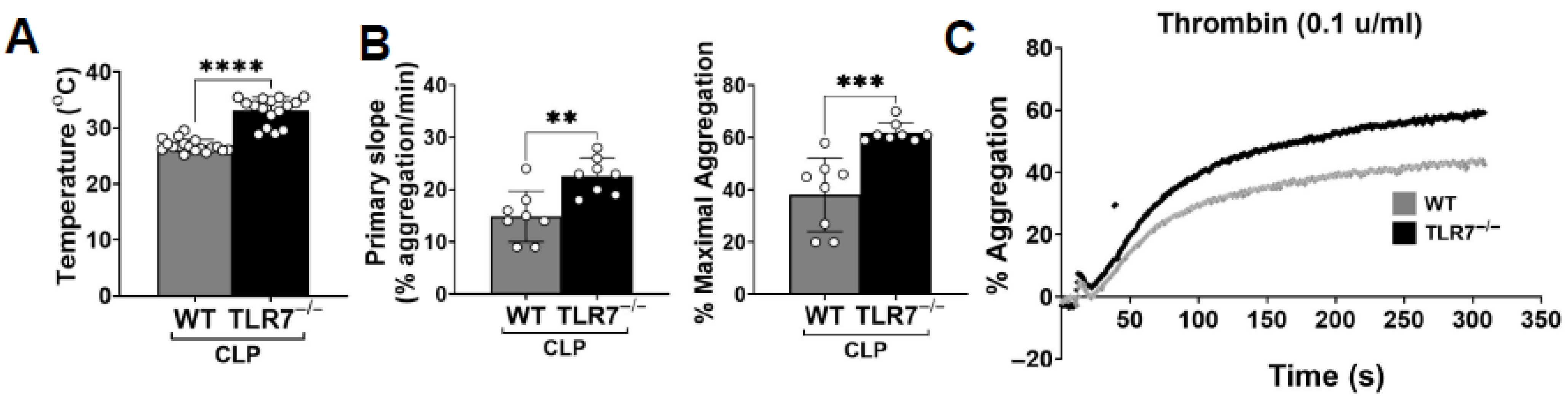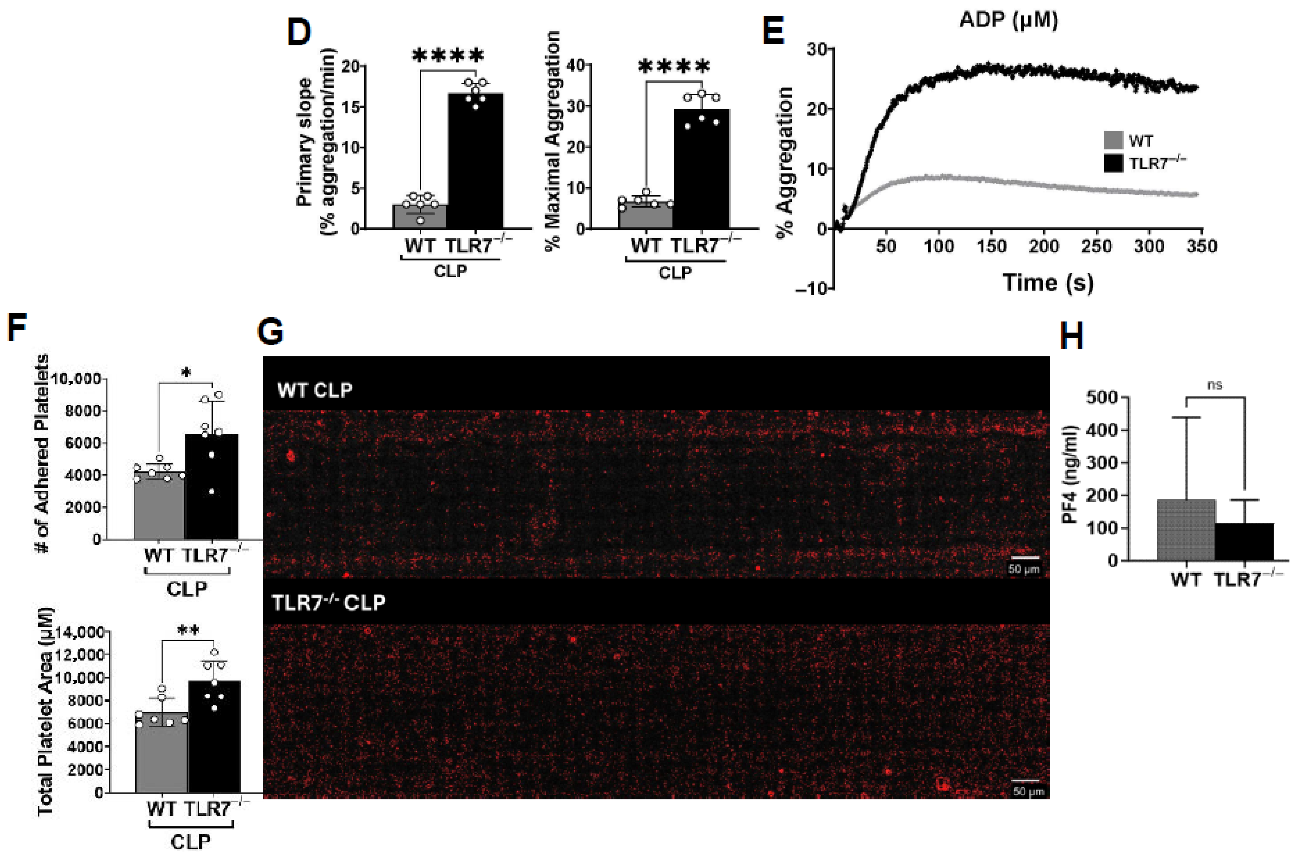 −/− septic platelets show better aggregation and adhesion compared to WT septic platelets. These findings indicate that TLR7 inflammatory signaling contributes to the development of platelet hyporeactivity in sepsis.