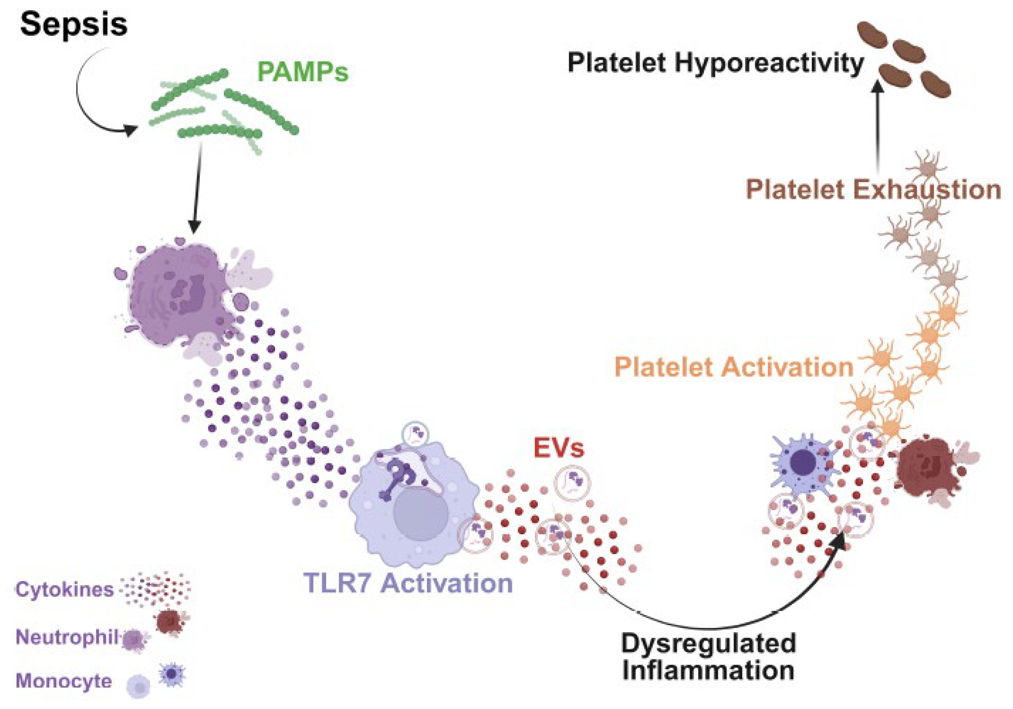 TLR7 recognizes single-stranded RNAs and has a nuanced role in polymicrobial sepsis. Although TLR7 signaling in platelet activation historically has been studied in viral diseases such as EMCV-1 [