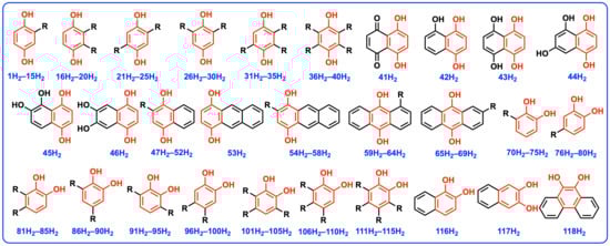 In this study, the thermodynamic properties of 118 hydroquinones are investigated. These hydroquinones encompass 69 p-hydroquinones (1H2–69H2, denoted as QpH2) and o-hydroquinones (70H2–118H2, denoted as QoH2), and the quinone forms of 118 hydroquinones are depicted in Scheme 1. Thermodynamic driving forces of 12 chemical processes for Q/QH2 couples accepting or releasing two hydrogen atoms in DMSO are derived or calculated in accordance with Hess’s law []. The resulting thermodynamic data enable us to examine and clarify the thermodynamic properties on hydrogenation and dehydrogenation of quinone/hydroquinone couples as hydrogen mediators. It should be noted that the thermodynamic driving force is a key factor in determining the kinetic process and it can only give thermodynamic guidance and judgment.