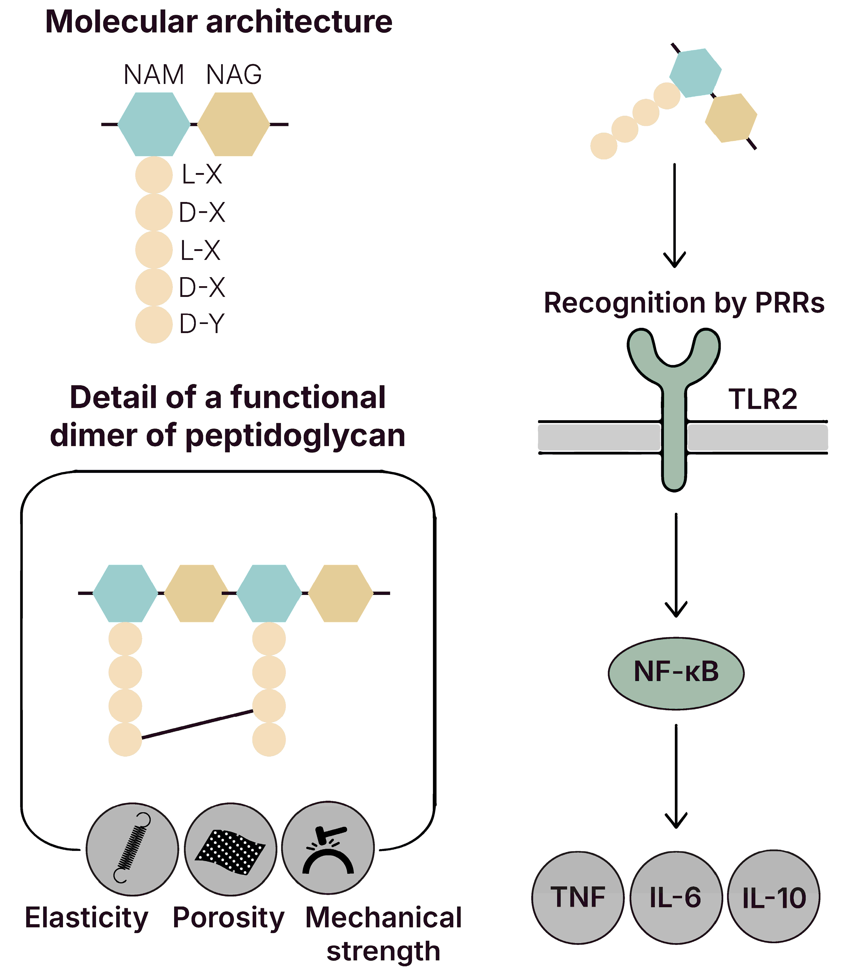 | Peptidoglycan | Muropeptide patterns and cell-wall modifications (e.g., O-acetylation via OatA, amidation) tune NOD1/NOD2 sensing and lysozyme susceptibility; in several lactobacilli strains, PGN/fragments tend to dampen IL-12 and NF-κB outputs, favoring regulatory/barrier-supportive profiles. | In pathogens, PGN modifications often promote lysozyme evasion and strong NOD/TLR priming, and the outcome is a pro-inflammatory bias. | [24,118,274,275,276] |