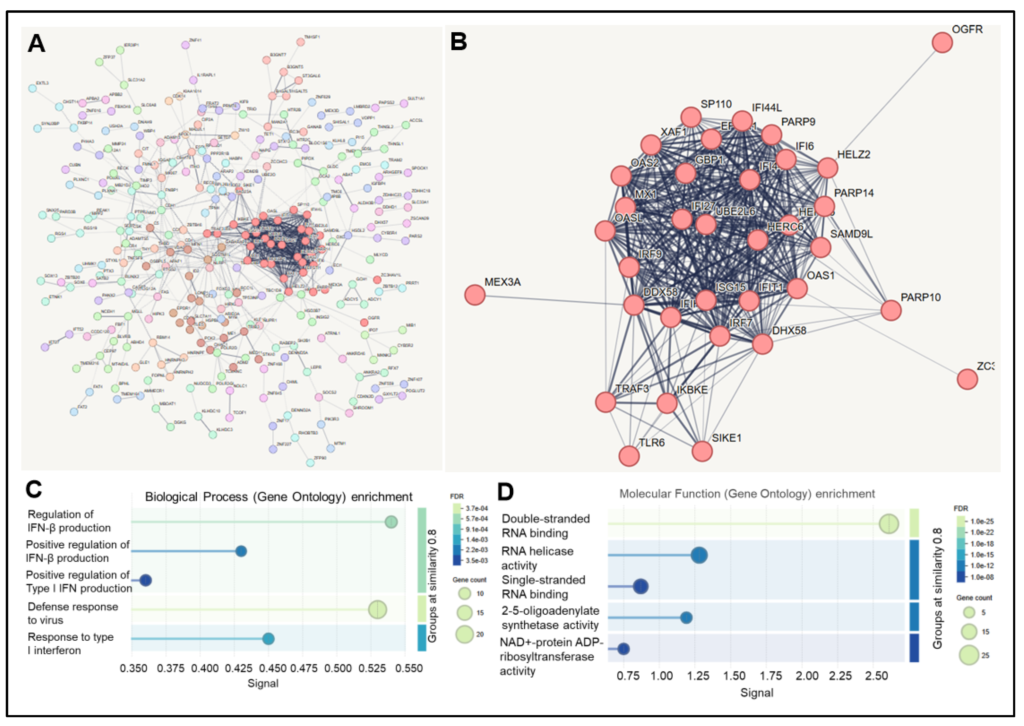 Figure 1B). Overall, there was a significant enrichment of several biological processes and molecular functions. The most enriched biological process was Defense Response to Virus (GO:0051607) (