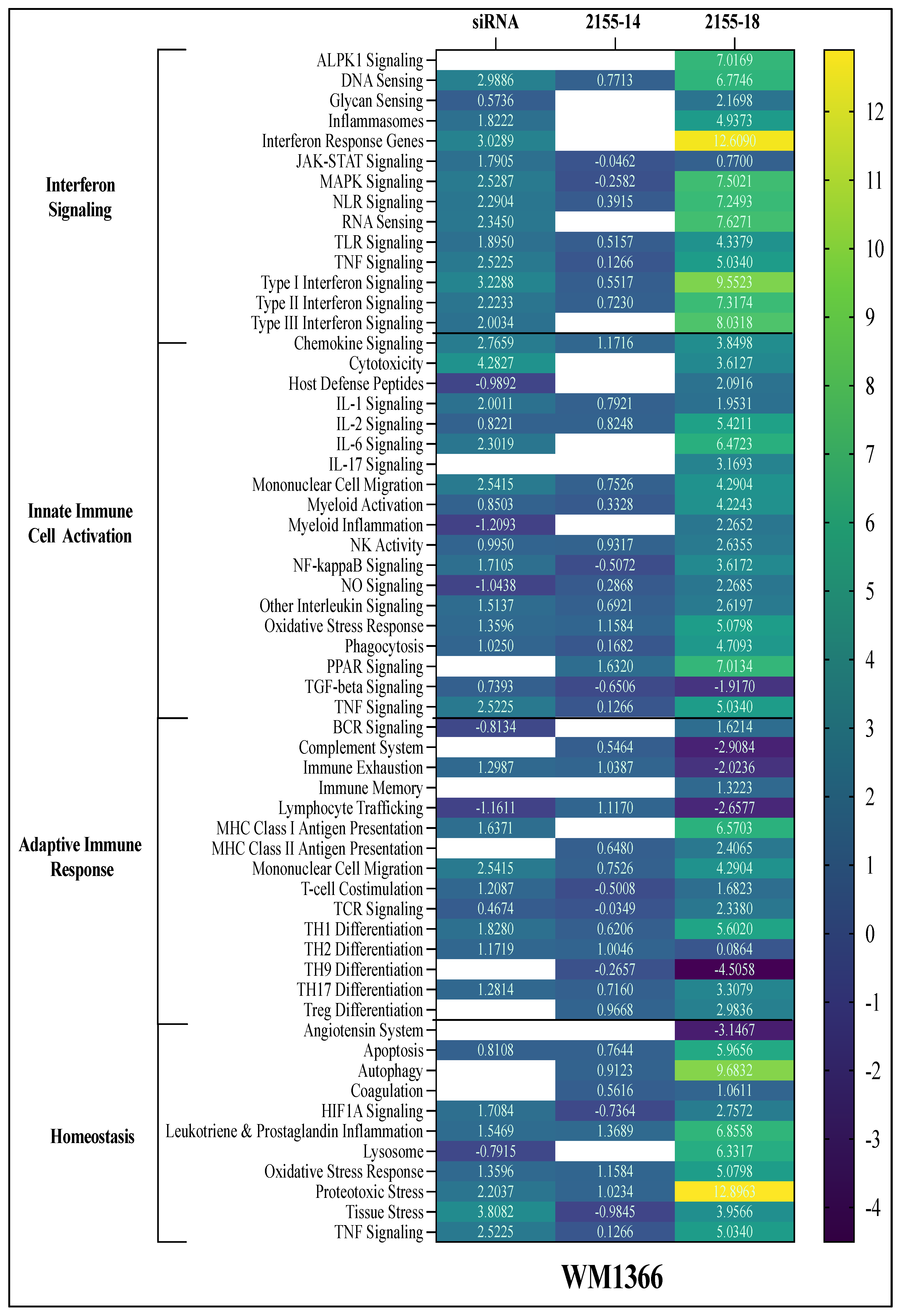 Figure 4). In the Innate Immune Activation phase, A375 response was muted compared to WM1366. A375 displayed the greatest downregulation of chemokine and IL-17 signaling, myeloid inflammation, and NK activity, and upregulation of IL-6, NF-κB, and TNF signaling. WM1366 showed the greatest upregulation of cytotoxicity, IL-6, mononuclear cell migration, and TNF signaling pathways. The adaptive immune response phase was similarly upregulated in both A375 and WM1366 cells. Upregulation of MHC class I and II antigen presentation, T cell co-stimulation, and mononuclear cell migration was the most noteworthy in this phase. In the Homeostasis phase, A375 displayed strong upregulation of lysosomal, apoptotic, and TNF signaling, while WM1366 exhibited proteotoxic and tissue stress and TNF signaling.
