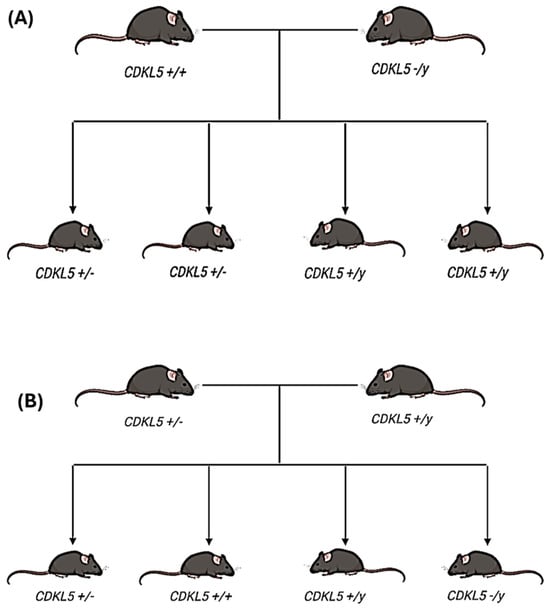Breeding scheme used to develop the initial experimental colony (A) and CDKL5 experimental mice (B). (A) The offspring produced from breeding wild-type (WT) female mice (CDKL5 +/+) with knock-out (KO) male mice (CDKL5 −/y) result in a 50% heterozygous female (Het) (CDKL5 +/−) and a 50% WT male mice (CDKL5 +/y) population. (B) A WT male mouse (CDKL5 +/y) is bred with Het female mice (CDKL5 +/−). The offspring produced by the breeding scheme include WT female (CDKL5 +/+), WT male (CDKL5 +/y), Het female (CDKL5 +/−), and KO male (CDKL5 −/y); each offspring has equal probability.