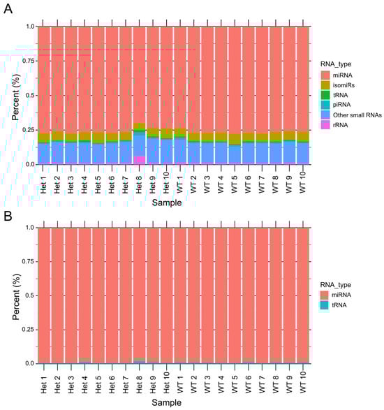 Small RNA landscape of hippocampal tissue from heterozygous (Het) and wild-type (WT) mice. (A) Bar plot representing the distribution of various small RNA species detected in hippocampal tissue samples from 10 Het and 10 WT mice. The different colors correspond to distinct small RNA categories, including miRNAs, snoRNAs, snRNAs, and tRNAs. This plot illustrates the relative abundance of each RNA type in the samples, showing the overall landscape of small RNA composition. (B) Bar plot focusing on the proportion of miRNA and tRNA reads in the hippocampal tissue from Het and WT mice. The majority of reads mapped to miRNAs, indicating their dominance in the small RNA population in these samples.