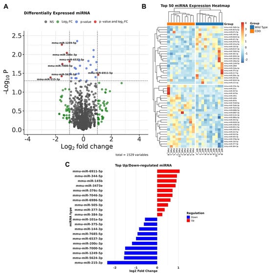 A total of 1529 miRNAs were detected in the hippocampal tissue of both groups (Figure 3A). The most abundant were known brain-enriched miRNAs including miR-124-3p, miR-128-3p, miR-132-3p, and miR-134-5p. The top 50 differentially expressed miRNAs distinguishing the WT and CDD groups are shown in Figure 3B, although not all reached statistical significance. In CDD mice, 18 miRNAs, namely, miR-150-3p, miR-1249-5p, miR-200c-3p, miR-1969, miR-6537-3p, miR-7000-5p, miR-467a-5p, miR-375-3p, miR-1943-5p, miR-101c, miR-7685-5p, miR-297b-5p, miR-5624-3p, miR-215-3p, miR-144-3p, miR-101a-5p, miR-6929-3p, and miR-671-5p, were significantly downregulated, while 11 miRNAs, namely, miR-376c-5p, miR-7046-3p, miR-377-3p, miR-344-5p, miR-505-3p, miR-222-5p, miR-145b, miR-6986-5p, miR-6911-5p, miR-3473e, and miR-384-3p, were significantly upregulated (Figure 3C).