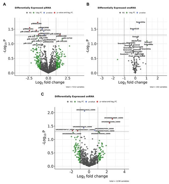 Our results also revealed the altered expression of other ncRNAs in hippocampal samples, including piRNAs (Figure 6A), snoRNAs (Figure 6B), and snRNAs (Figure 6C), which were significantly differentially expressed (p < 0.05) between Het and WT groups, as shown in the volcano plots. For example, among piRNAs, piRNA-1284 was upregulated, while piR-3351 was downregulated. In the snoRNA plot, Snord32a (downregulated) and Snord110 (upregulated) showed significant changes. However, the overall expression levels of these ncRNA classes were very low.