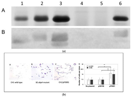 (a) Filter-concentrated supernatants from overnight TSBY cultures. Lane 1, CH1 (S. gordonii wild-type, parental strain); 2, CH1/pVA749 (parental strain with replicative plasmid); 3, CH1/pFS001 (parental strain with plasmid containing abpA); 4, B2 (AbpA-deficient CH1); 5, B2/pVA749 (AbpA-deficient CH1 with replicative plasmid); 6, B2/pFS001 (AbpA-deficient CH1 with plasmid containing abpA). A. Gel: Equal concentrations of protein were loaded onto 12% SDS-PAGE gel stained with AcquaStain (Bulldog Bio, Portsmouth, NH, USA). The major band of 20 kDa is AbpA. B. Far Western Blot: Proteins were transferred onto a PVDF membrane (Millipore-Sigma, Burlington, MA, USA), blocked with 3% skim milk in Tris-buffered saline with 0.1% Tween 20, incubated with purified human non-glycosylated salivary alpha-amylase, followed by primary antibody (rabbit anti-human amylase) and secondary antibody (goat anti-rabbit IgG conjugated with alkaline phosphatase (BioRad). Color was developed with nitro blue tetrazolium (NBT; Millipore-Sigma, Burlington, MA, USA). (b) Chain length of cells in mid-log phase. A, B, C, Gram stain. D, number of cells per chain. Strains: CH1 (wild type), B2 (abpA- mutant), B2/pFS001 (complemented mutant). Vectors: pVA749 (empty vector); pFS001 (pVA749 with abpA). ** Statistically significant (0.05).