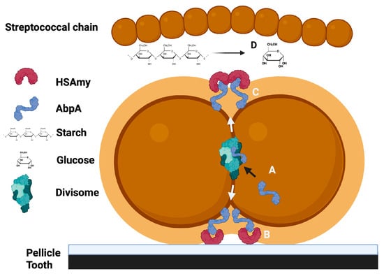 A summary of the potential roles for the HSAmy-AbpA interaction. A. AbpA is expressed, incorporated into the cell divisome and then released to the cell surface at the cell division septum. B. AbpA binds to HSAmy within salivary pellicle to promote bacterial adhesion to the tooth. C. HSAmy binds soluble enzymatically active HSAmy. D. Dietary starch is hydrolyzed, releasing simple sugars that can be utilized by the bacteria for energy.