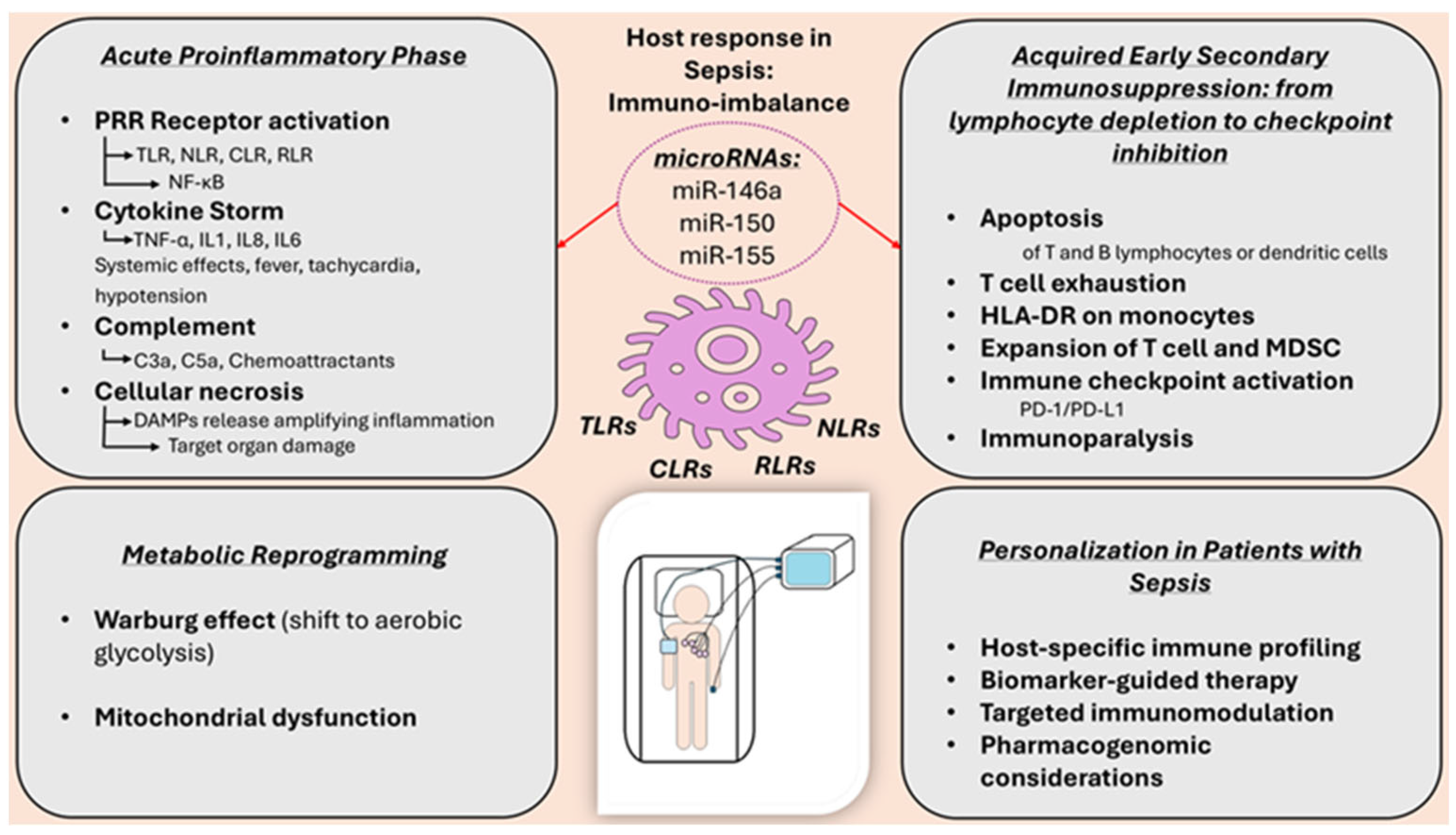 Sepsis is characterized by complex systemic immune dysfunction, including early imbalances between proinflammatory hyperactivation and profound, progressive immunosuppression [