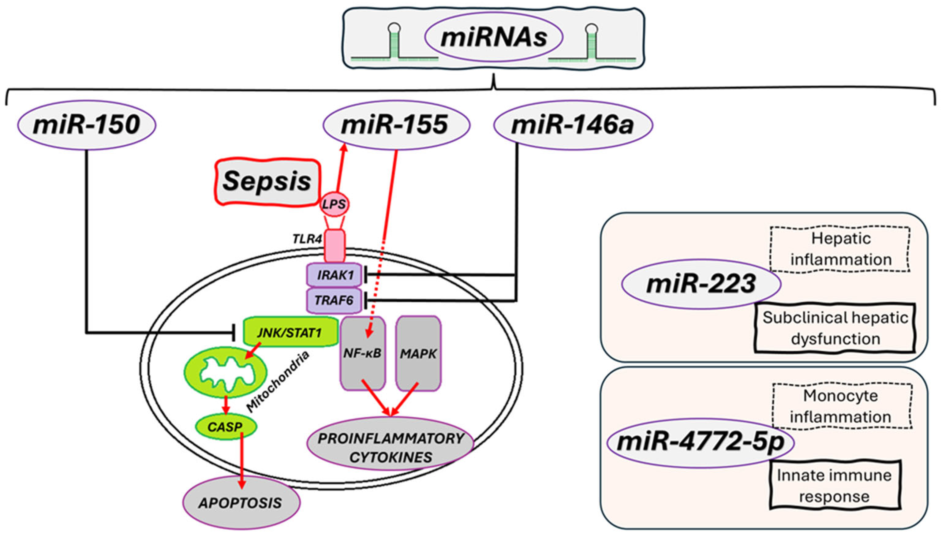 miRNAs regulate various molecular pathways involved in sepsis, including those that trigger inflammatory responses, oxidative stress, apoptosis, and angiogenesis. Several studies have reported altered levels of miRNAs in sepsis patients, such as miR-150, miR-146a, and miR-223. These changes have been linked to disease severity, organ failure, and risk of death.