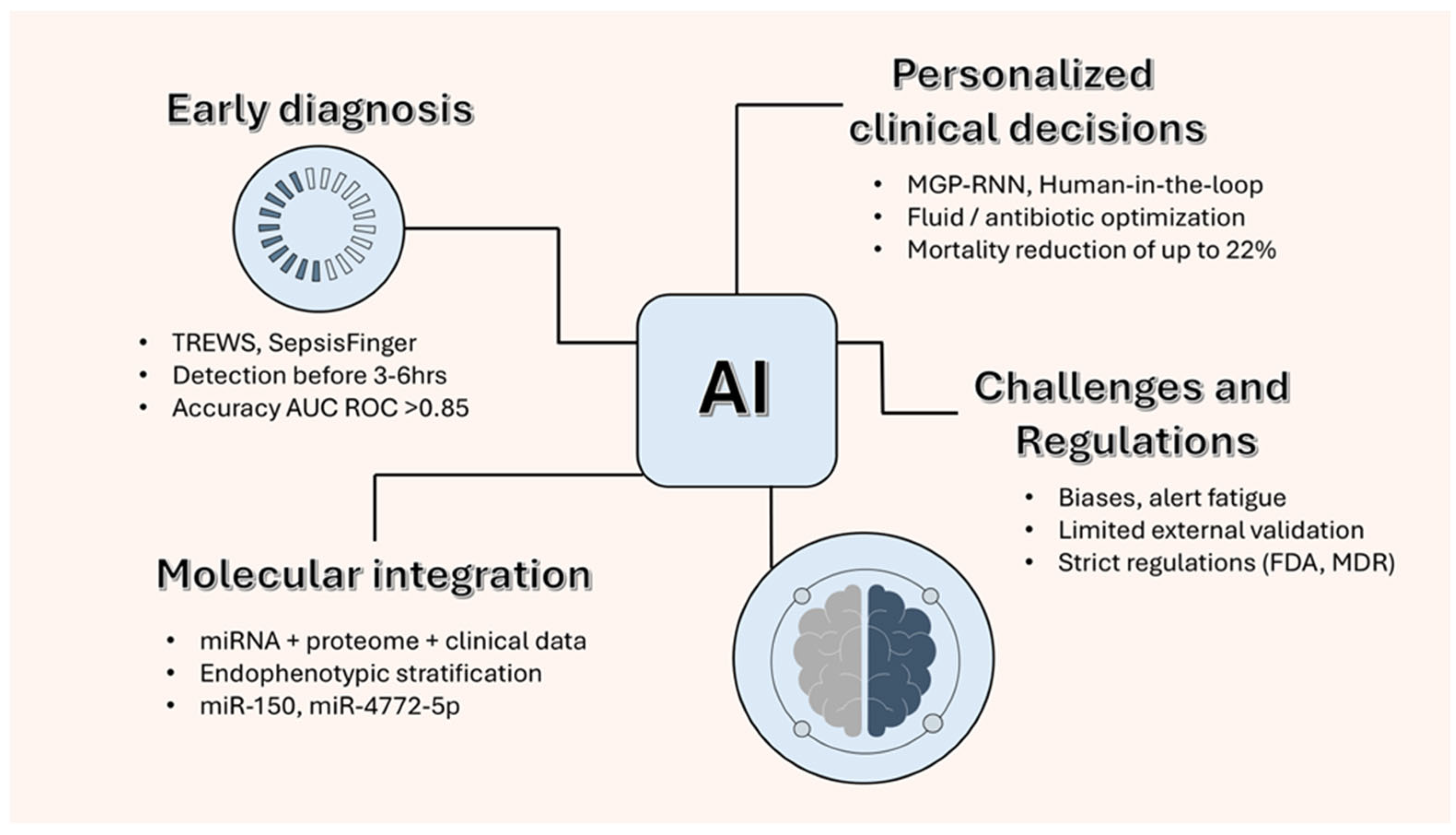 - Bignami, E.G.; Berdini, M.; Panizzi, M.; Domenichetti, T.; Bezzi, F.; Allai, S.; Damiano, T.; Bellini, V. Artificial Intelligence in Sepsis Management: An Overview for Clinicians. J. Clin. Med. 2025, 14, 286. [Google Scholar] [CrossRef] [PubMed]