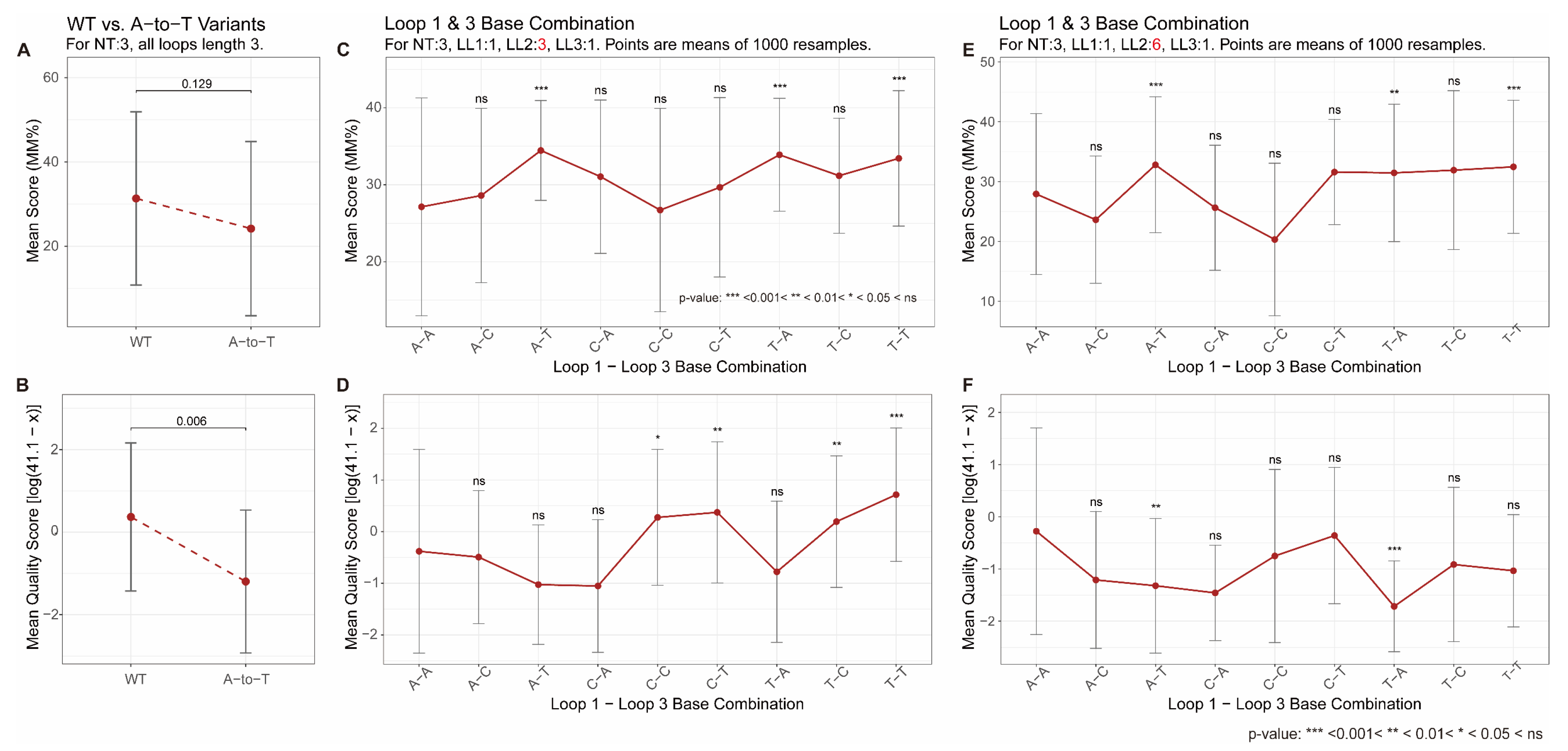 | Loop Base Composition | The effect is highly context-dependent; adenine can be stabilizing or destabilizing depending on structural context [67,70,71,72,73] | Partially Consistent (Figure 6) |