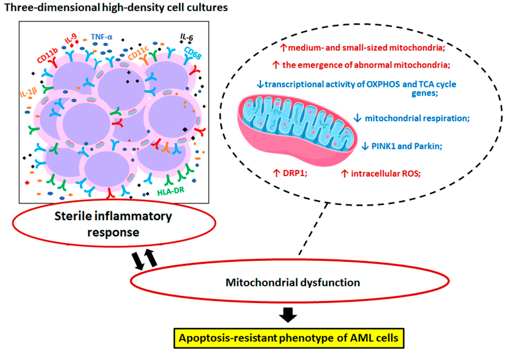 Meshcheriakova, E.I.; Krasnov, K.S.; Odinokova, I.V.; Lomovsky, A.I.; Krestinina, O.V.; Baburina, Y.L.; Mikheeva, I.B.; Mikhailova, G.Z.; Senotov, A.S.; Nekhochina, P.S.; et al. Mitochondrial Dysfunction in Apoptosis-Resistant Acute Myeloid Leukemia Cells During a Sterile Inflammatory Response. Biomolecules 2025, 15, 1635. https://doi.org/10.3390/biom15121635