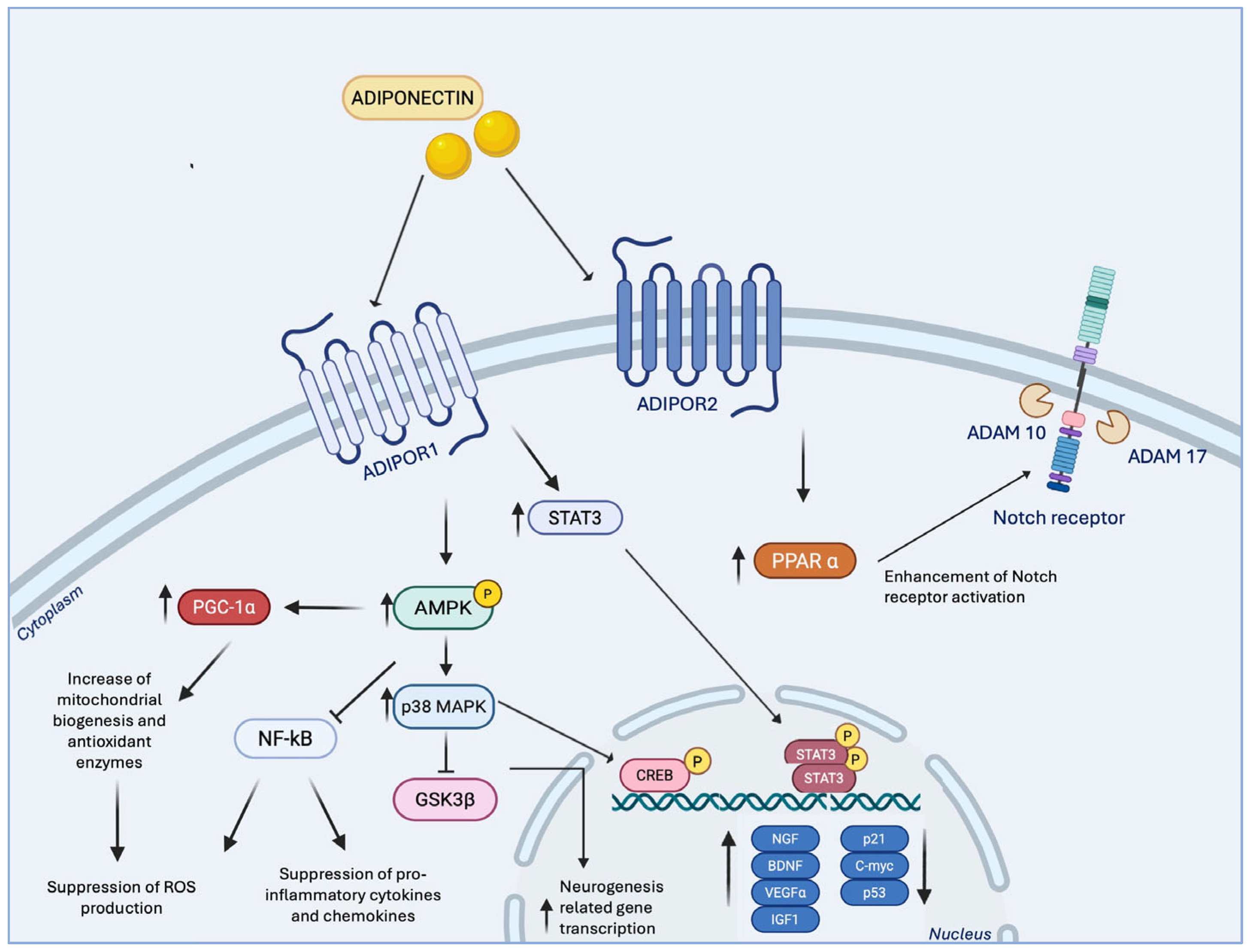 Taken together, these findings highlight that beyond its established role in metabolic regulation, adiponectin is a central mediator of neuroplastic processes. By translating external beneficial stimuli, such as physical activity, into enhanced hippocampal plasticity, resilience to stress, and improved cognitive and emotional function, adiponectin orchestrates multiple intersecting signalling pathways—including AMPK, BDNF, and Notch. These pathways do not act in isolation; rather, they dynamically interact to stimulate neurogenesis while safeguarding neuronal integrity against stress and inflammatory damage. This sophisticated profile positions adiponectin as a promising molecular bridge between lifestyle factors and brain health, with potential therapeutic relevance for neuropsychiatric disorders.